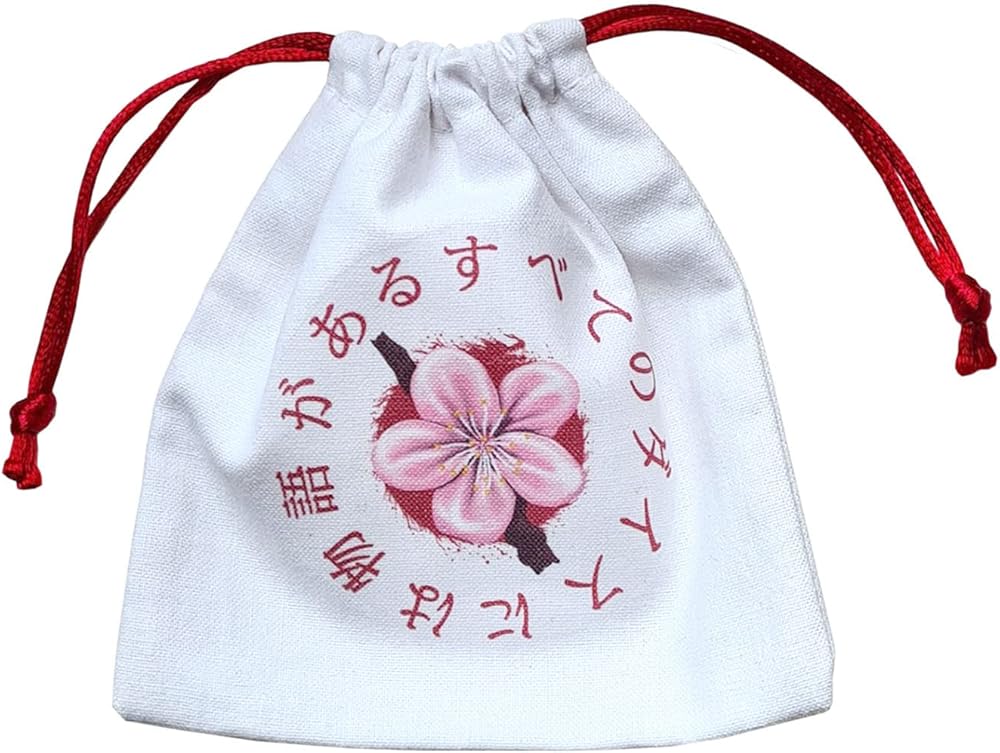 A symbol of changing seasons. This dice bag, made of sturdy white cotton, features a blooming sakura flower on the branch of a cherry tree, surrounded by the phrase "All dice tell a story" written in kanji characters. It is closed with durable deep-red linen strings and can hold 5 full sets of dice. Representing a symbol of changing seasons, it fits perfectly with the Japanese Dice Sets.