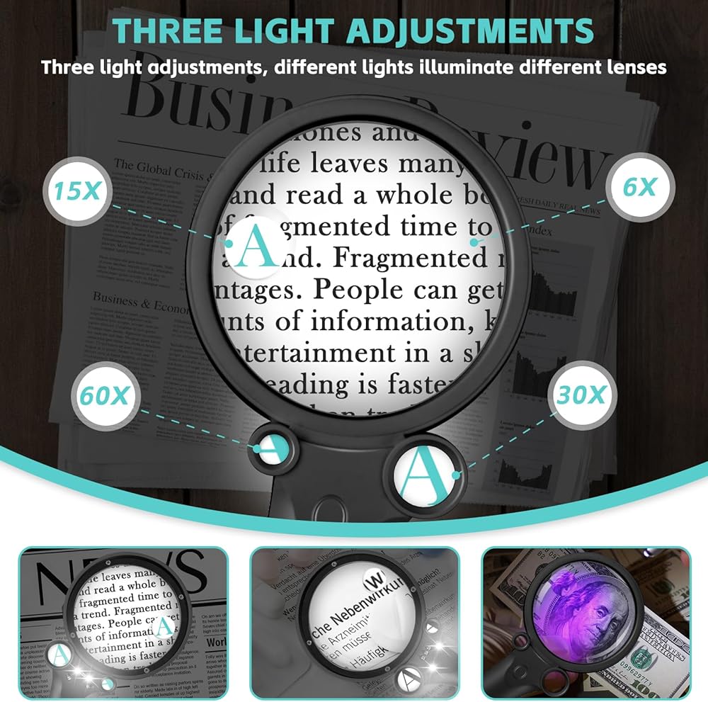 سطوع فريد من نوعه: 4 مصابيح LED مدمجة، كل عدسة مضاءة بضوء مناظر، مما يوفر إضاءة إضافية عند القراءة في المساحات ذات الإضاءة الخافتة، مثالي للأشخاص الذين يعانون من ضعف الرؤية أو الضمور البقعي؛ يمكن استخدام ضوء الأشعة فوق البنفسجية لتحديد الأوراق النقدية وجوازات السفر واللوحات وما إلى ذلك لمكافحة التزييف.
