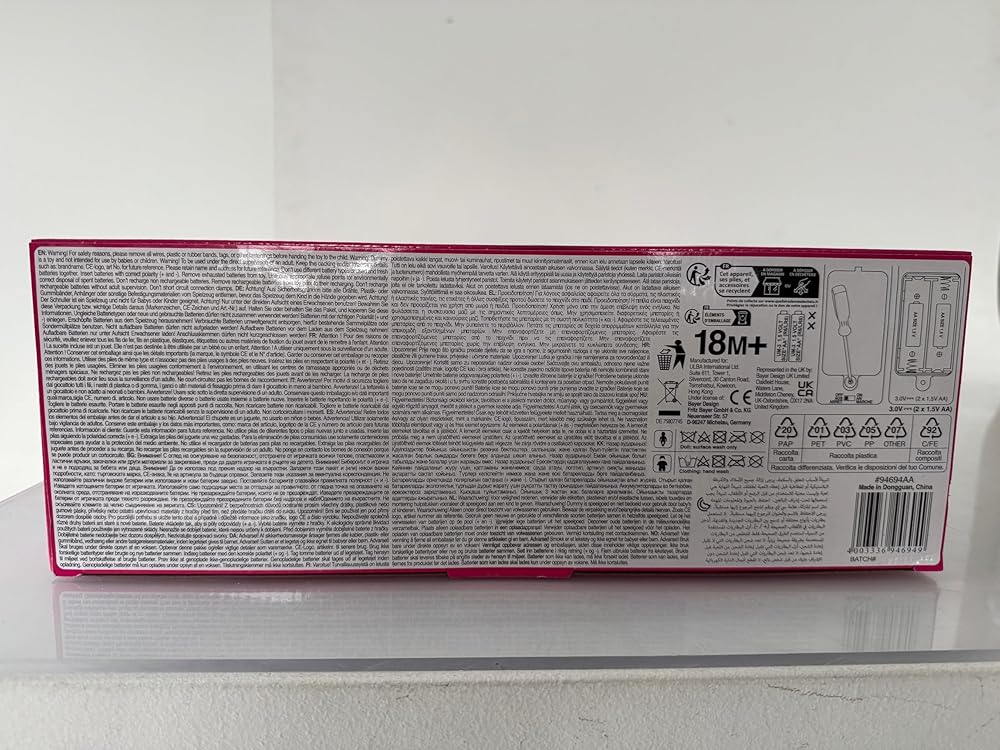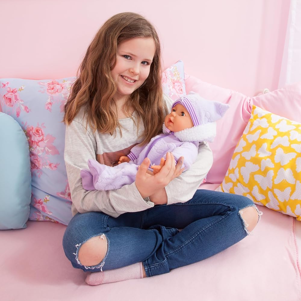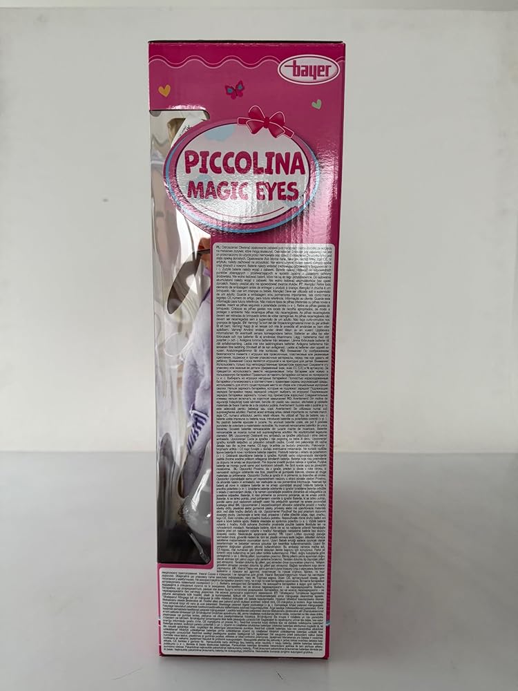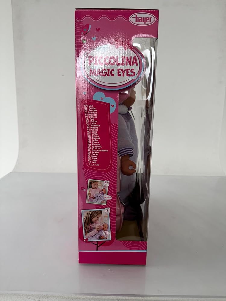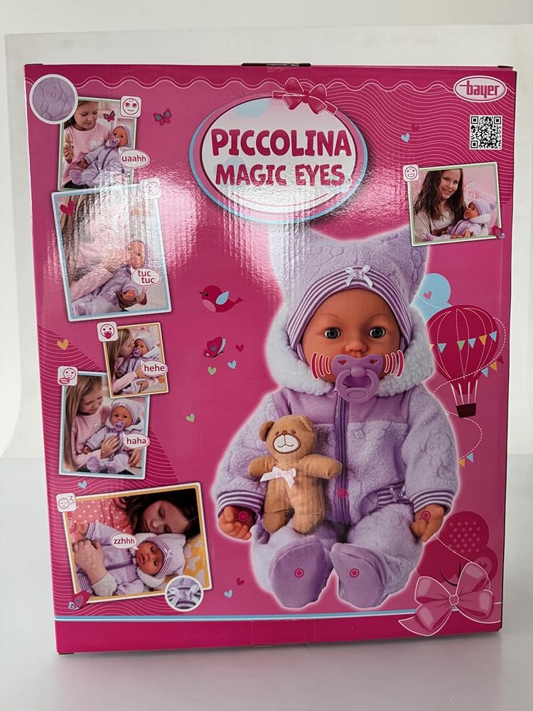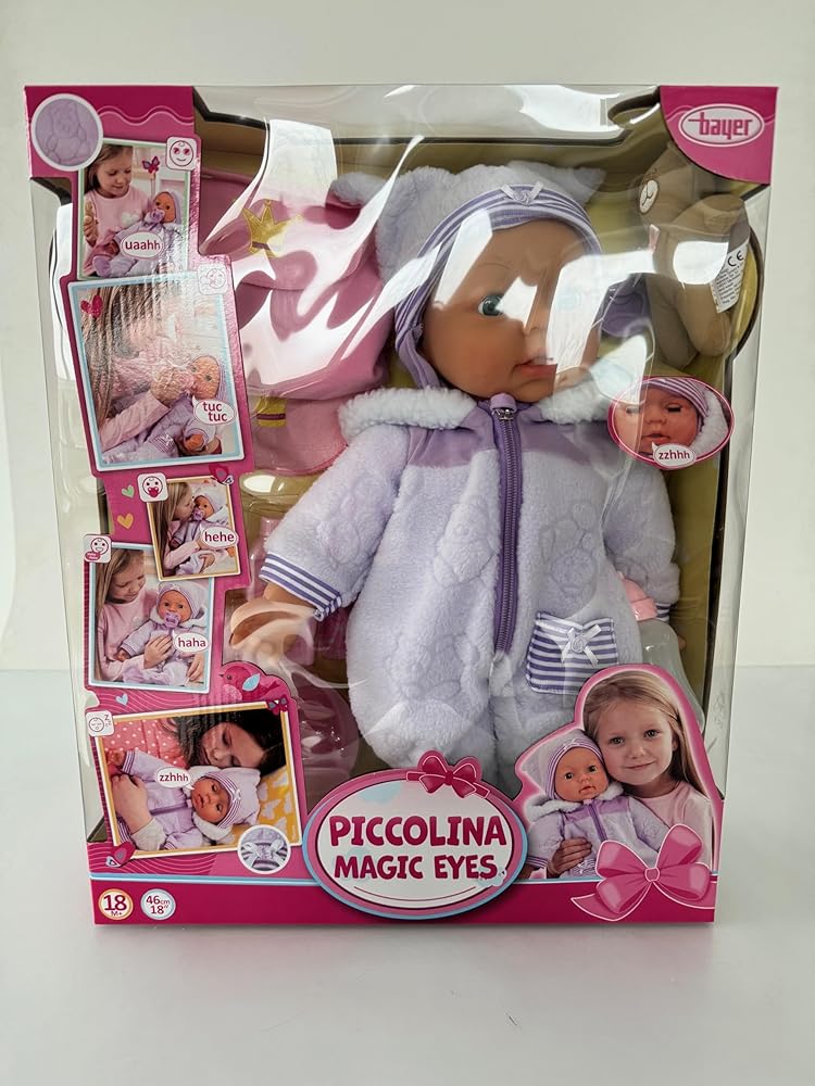 Piccolina Magic Eyes is a sweet 46cm soft-bodied doll with functions. If you press her right hand, she makes different baby sounds, closes her eyes and falls asleep. Tickle her feet and she will laugh. If you touch her tummy, she will blink and be happy. If you feed her with the bottle, she will make drinking sounds and move her mouth. Additionally, an extra bag, bib, teddy bear, plastic tableware, care accessories, pacifier and a bottle are included in the set. Delivered in a beautiful showbox.