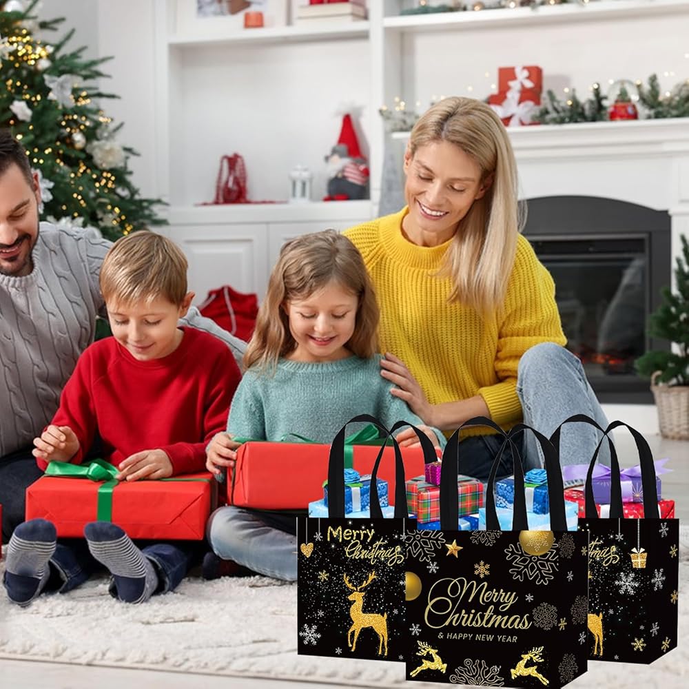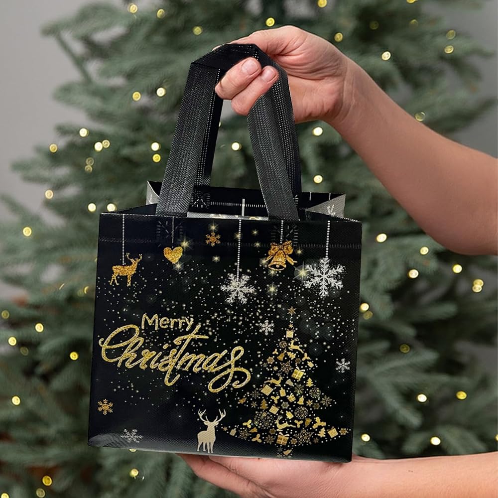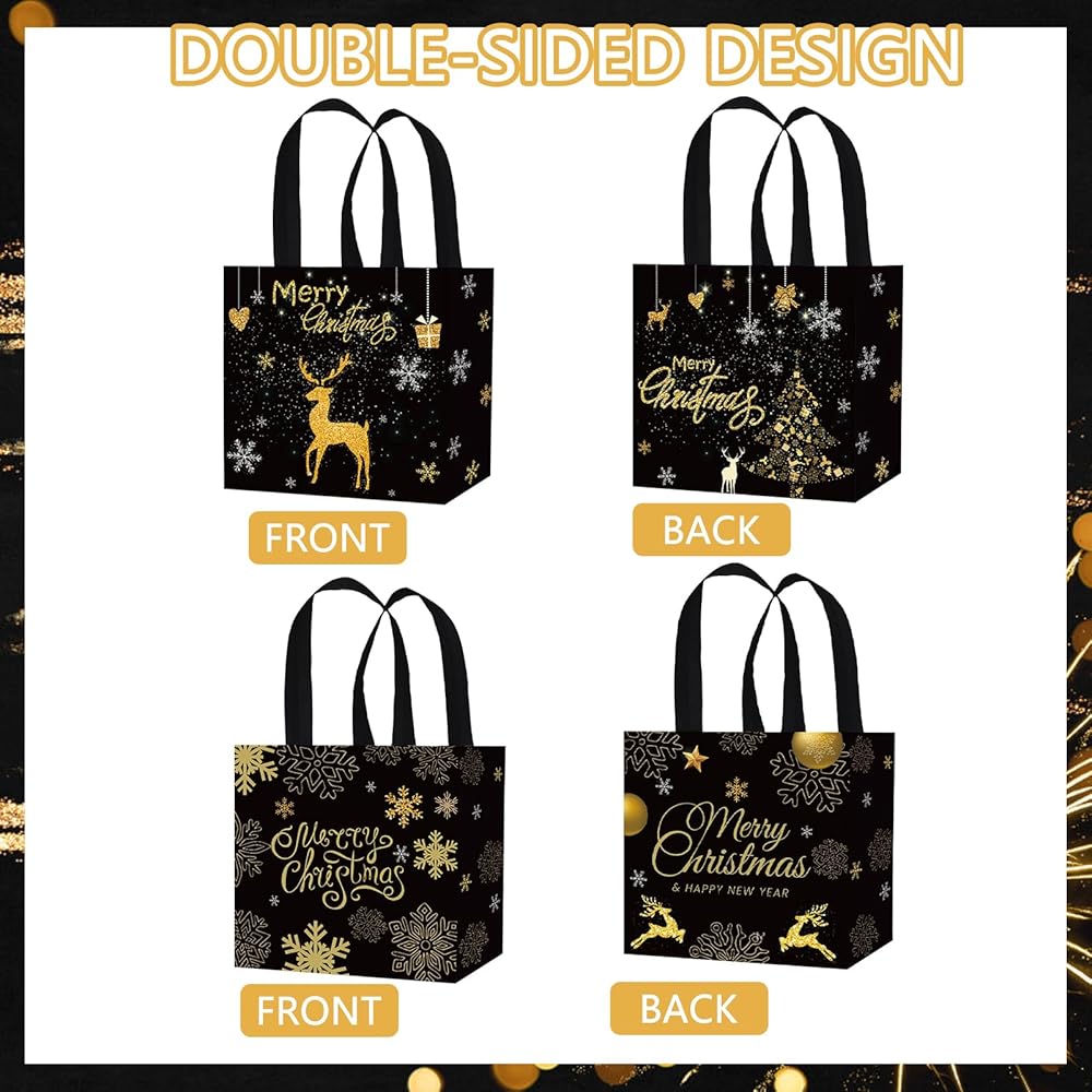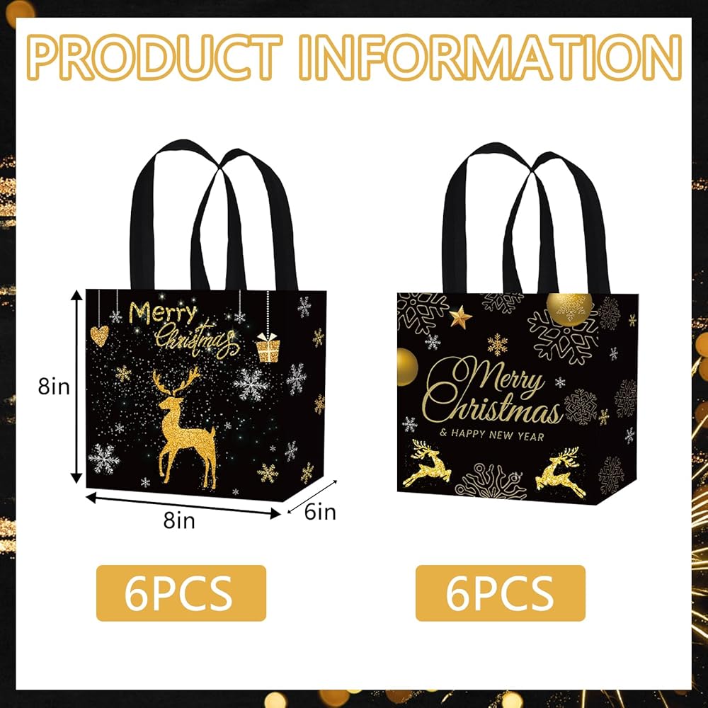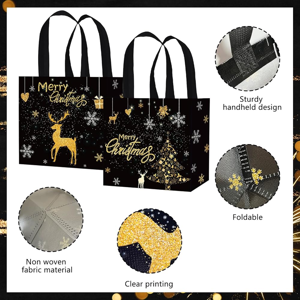 • Package Includes: A total of 12 gold black Christmas non-woven tote bags, with 2 designs, each color has a corresponding style, and each pattern has 6 bags. Sufficient quantity and rich patterns can meet your various Christmas party needs