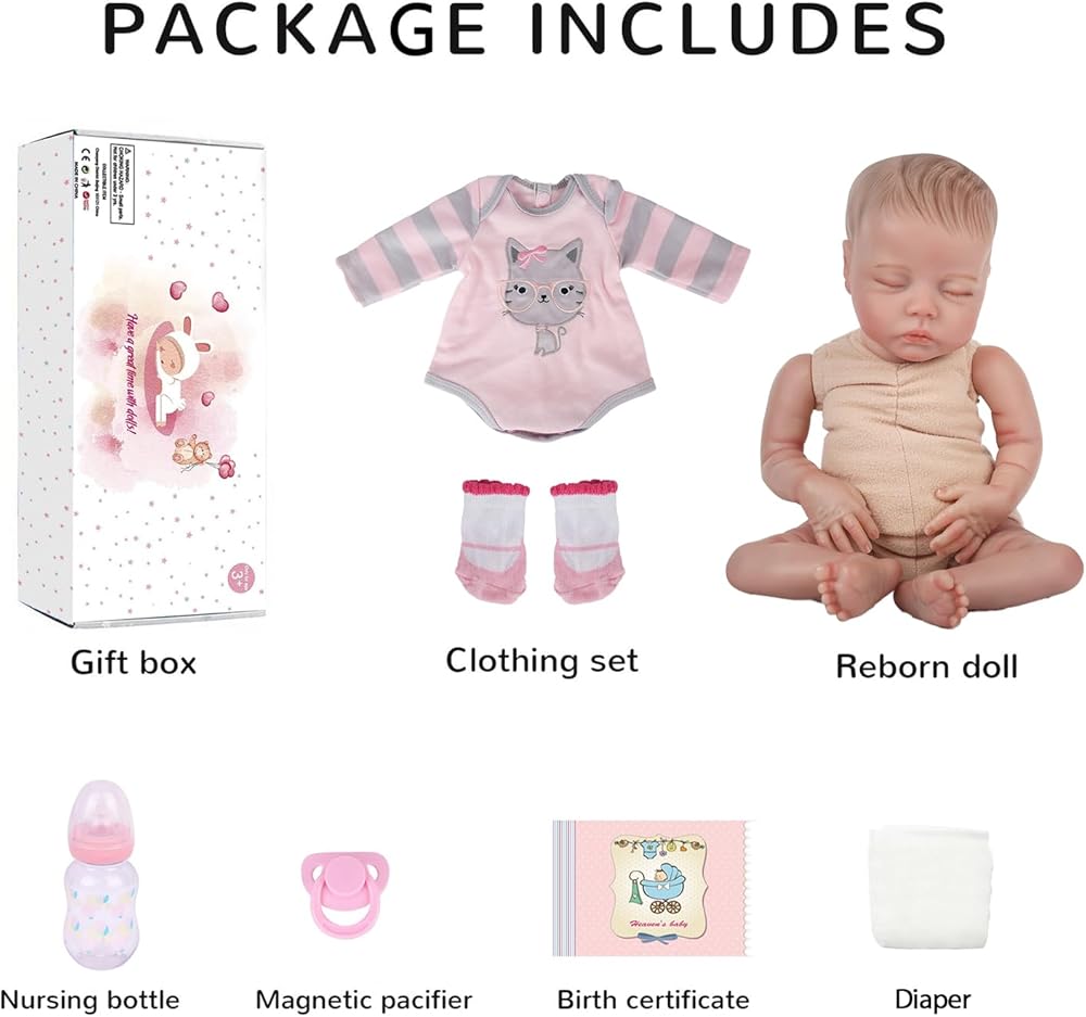 قائمة العبوة: دمية طفل حديث الولادة *1، بدلة *1 (تمامًا مثل الصورة)، مصاصة مغناطيسية *1، زجاجة *1، حفاضات *1، شهادة ميلاد *1