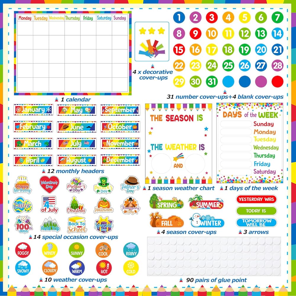 تشمل العبوة: سوف تحصل على تقويم واحد، ومخطط طقس موسمي واحد، ويوم واحد من أيام الأسبوع، و31 غطاء رقم، و4 أغطية فصول، و4 أغطية فارغة، و4 أغطية زخرفية، و14 غطاء للمناسبات الخاصة، و12 رأسًا شهريًا، 10 عمليات تغطية للطقس، 3 عمليات تغطية بالأمس واليوم وغدًا؛ تشتمل مجموعة لوحة الإعلانات التقويمية هذه أيضًا على 90 زوجًا من الخطاف والحلقة، مما يسهل تغيير التاريخ والطقس