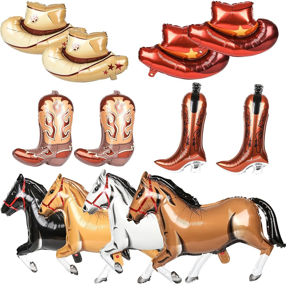 Elevate your western-themed birthday party with our delightful cowboy balloons set! This exclusive package includes a total of 12 western balloons, featuring 4 charming horse balloons in 4 styles, 4 iconic cowboy boot balloons in 2 styles, and 4 stylish cowboy hat balloons in 2 styles. Each cowboy foil balloon is designed to capture the spirit of the west, making them perfect for decorations that will enhance the festive atmosphere of your celebration.