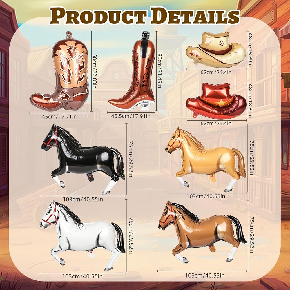 VALUE PACK: You will receive 12 pcs western balloons, includs 4 pcs horse balloons (4 styles), 4 pcs cowboy hat balloons (2 styles), 4 pcs cowboy boot balloons (2 styles). Large sizes and diverse styles can meet your decoration needs