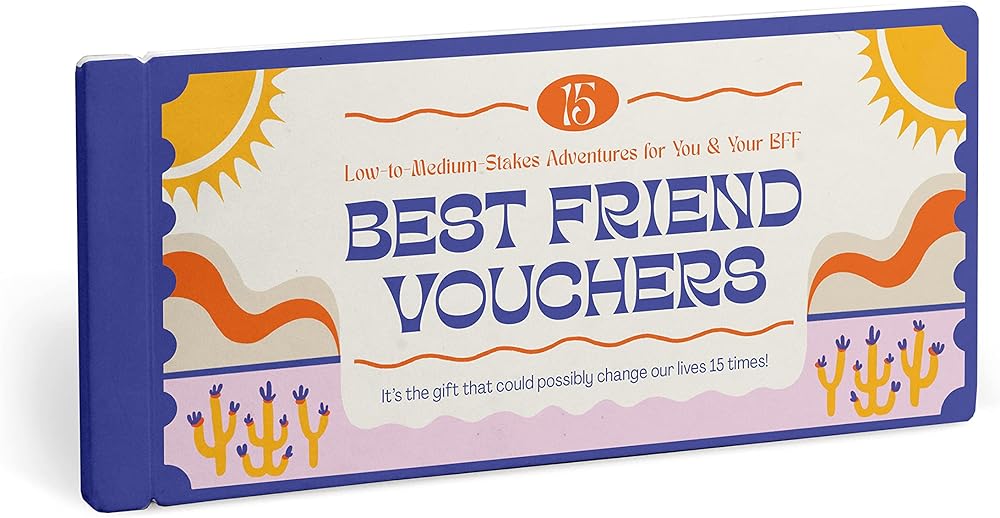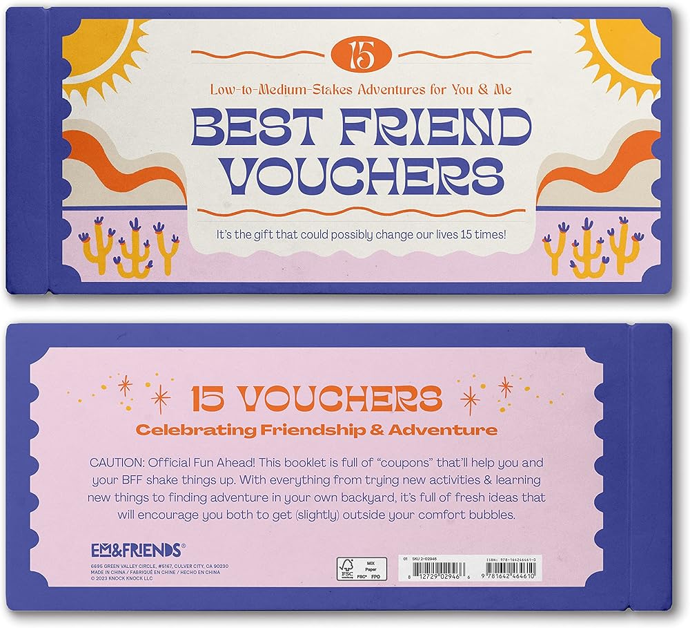 Sold as a single unit containing 15 unique perforated vouchers; 7.5 x 3.25 inches. Give your best friend the gift of adventure and meaningful experiences you can customize and share together! This creative, inspiring coupon book from Em & Friends offers you and your BFF fifteen open-ended friendship activities like day-tripping, crafting, communing with Mother Nature, volunteering, and JUST BEING. . . together! Dream up some adventure with this voucher book! For the BFF who has everything: a diy coupon book. Em & Friends makes cards and products for the relationships people really have and the lives we really lead—ones that are messy & beautiful, tricky & wonderful, and a whole bunch of everything else in between