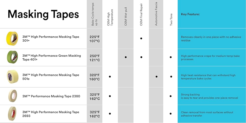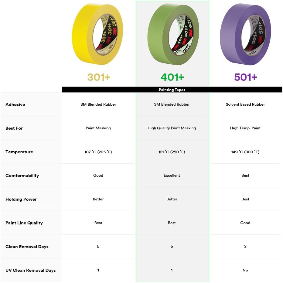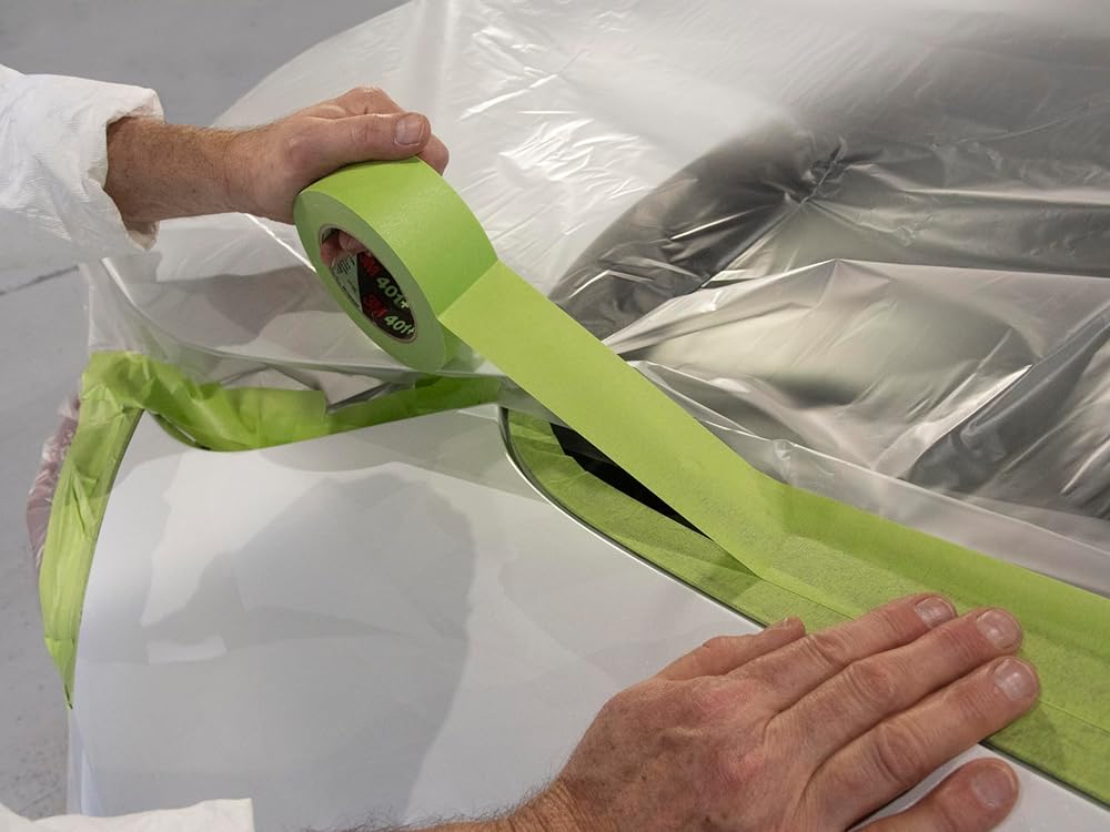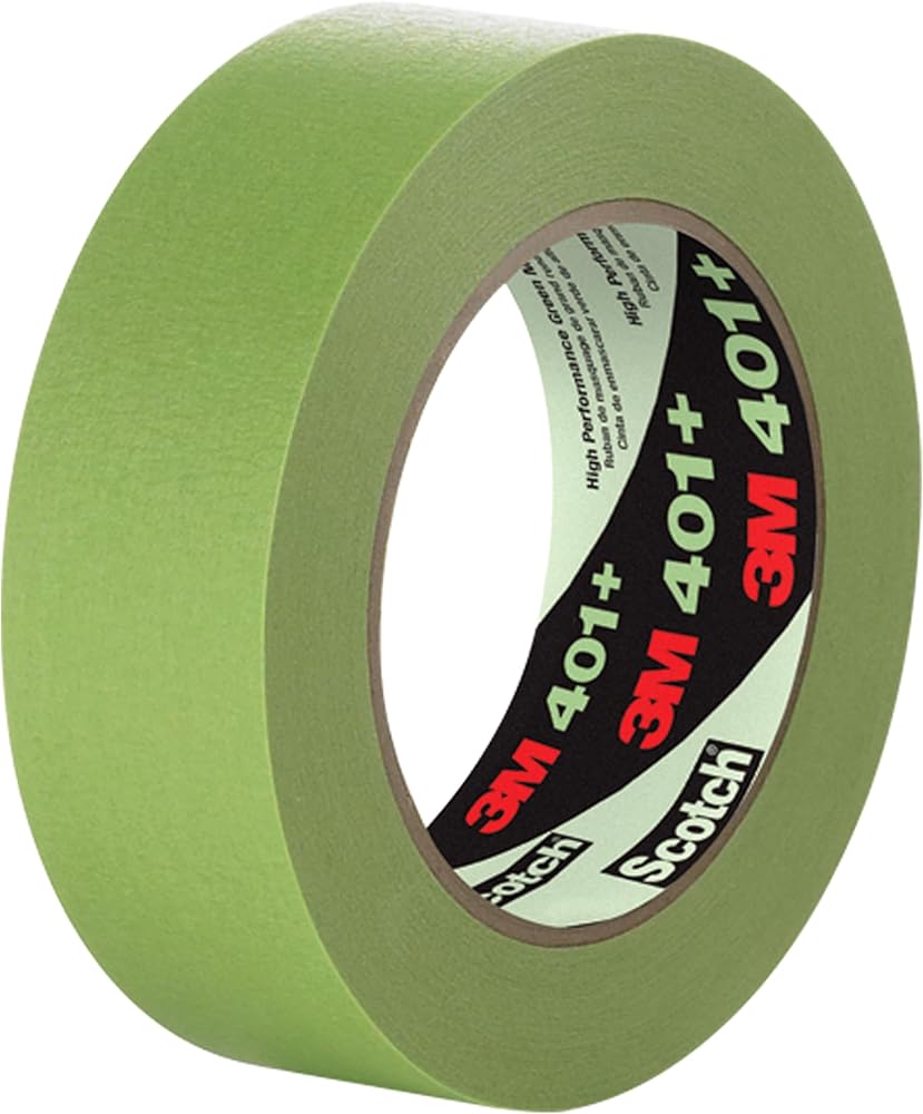 3M High Performance Green Masking Tape 401+ was designed to deliver sharp paint lines and is ideal for critical paint masking applications in automotive, specialty vehicle and industrial markets where strong holding and high temp performance is required. The high-strength green crepe paper backing conforms to irregular surfaces, resists bleed-through from most industrial paint systems, improves visibility and accuracy during the paint masking process, and helps achieve super-sharp paint lines. Featuring a proprietary solvent-free adhesive, the tape sticks instantly to most surfaces, including metal, rubber, glass and plastic, while removing cleanly in one piece. Withstands surface temperatures up to 250º F/121º C for 30 minutes.