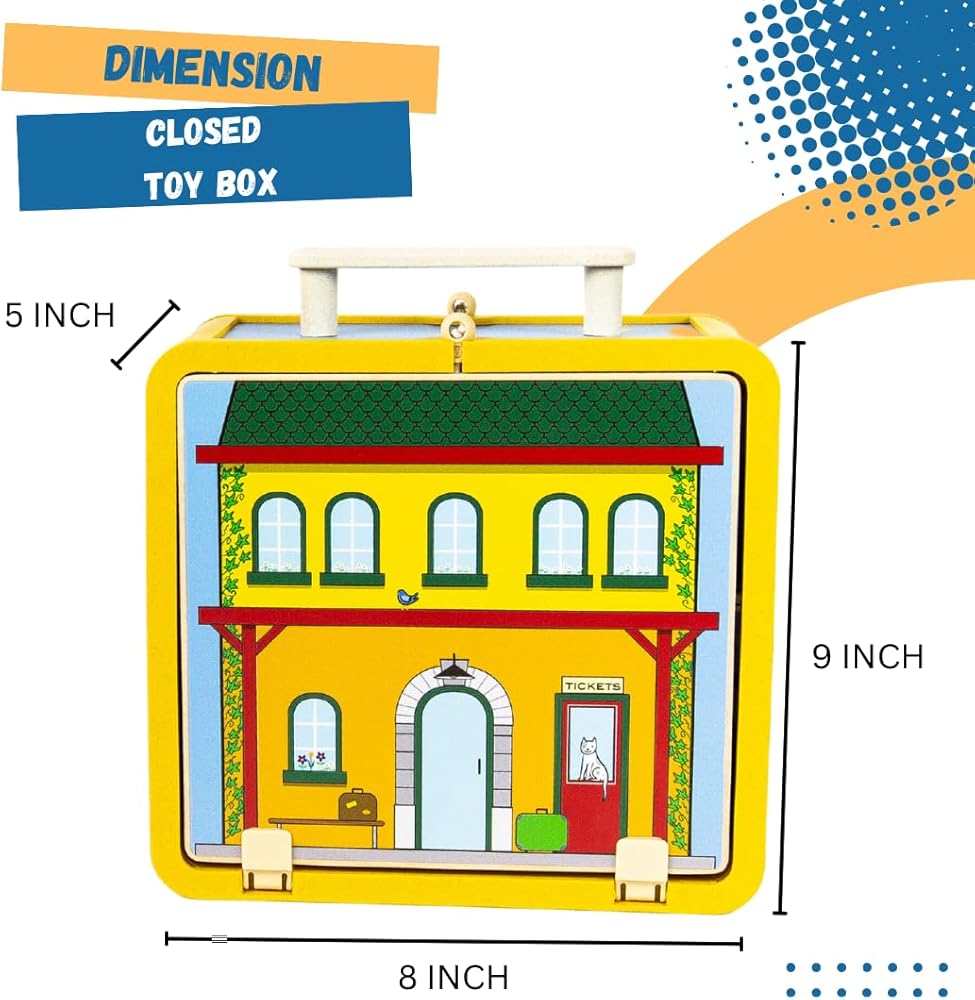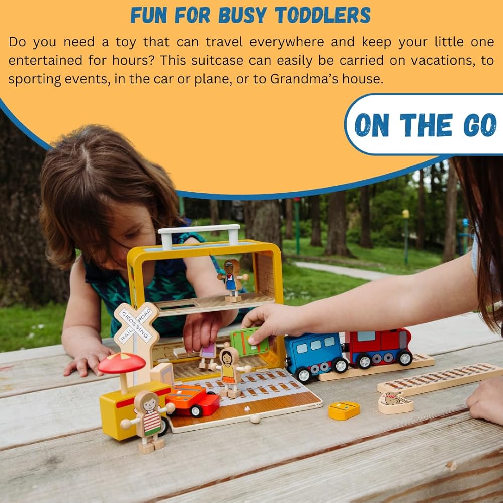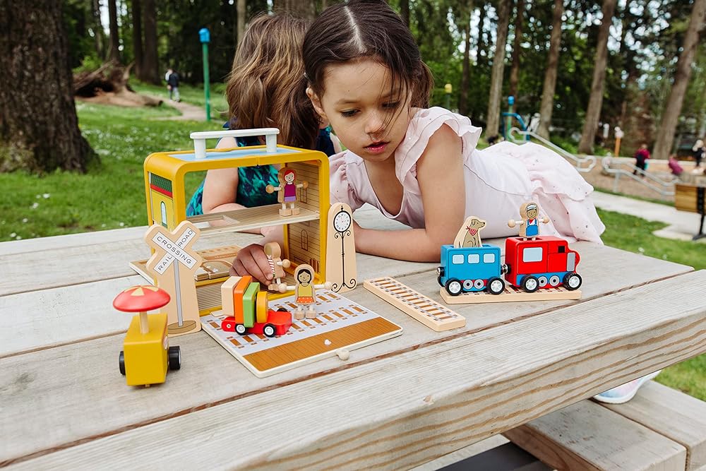 مجموعة قطار السفر الجميلة - تشو تشو! تفتح حقيبة الخيزران الملونة هذه لتكشف عن محطة قطار من طابقين. تخيل أن طفلك الصغير يستكشف محطة القطار، ويحمل عربة الأمتعة ويحدد إشارات المرور من خلال علامة عبور السكك الحديدية الخاصة بنا.