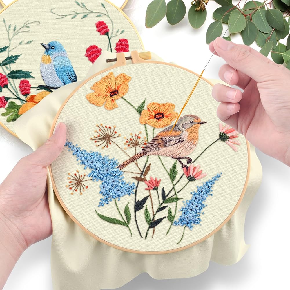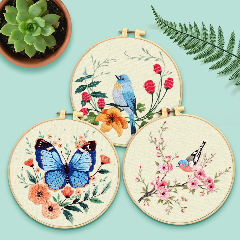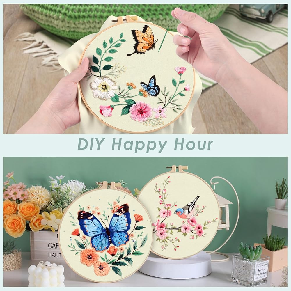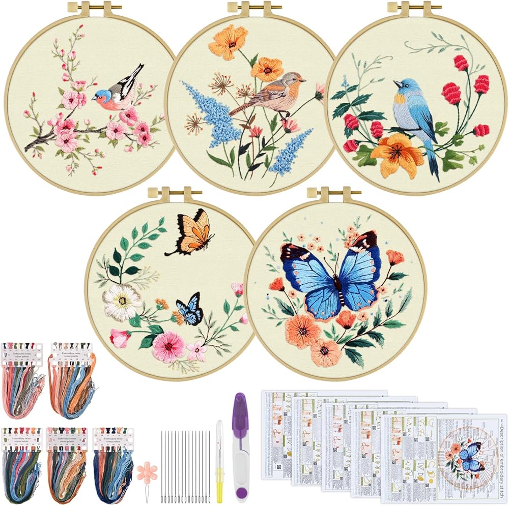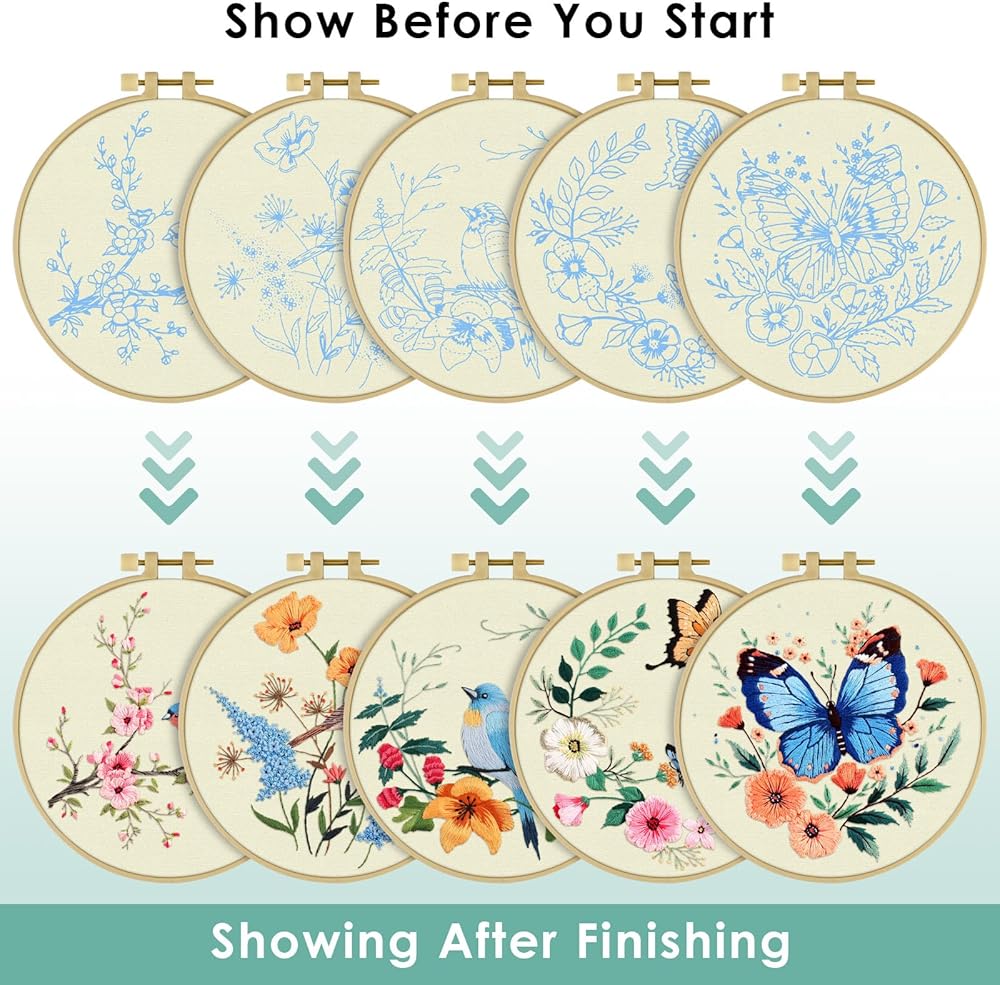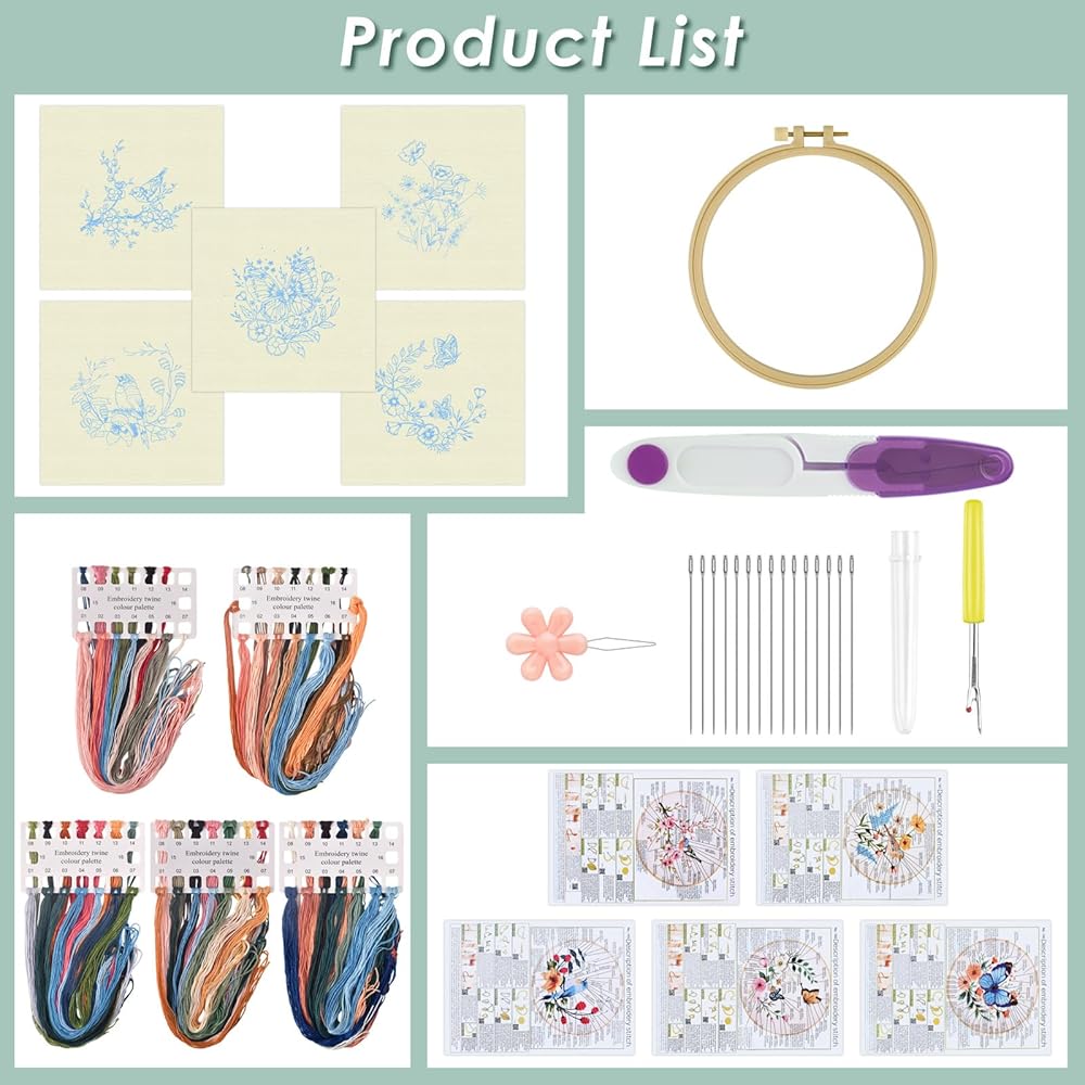 Practical Embroidery Kits:You will receive 1 piece 7.9 x 7.9 inch embroidery hoop,5 set of enough color threads, 5 pieces 11.8 x 11.8 inch embroidery fabric with pattern, 9 pieces embroidery needles, 5 pieces instructions, 1 piece scissor, 1 piece needle threaders, 1 piece seam ripper. A complete set to satisfy all your embroidery demand.