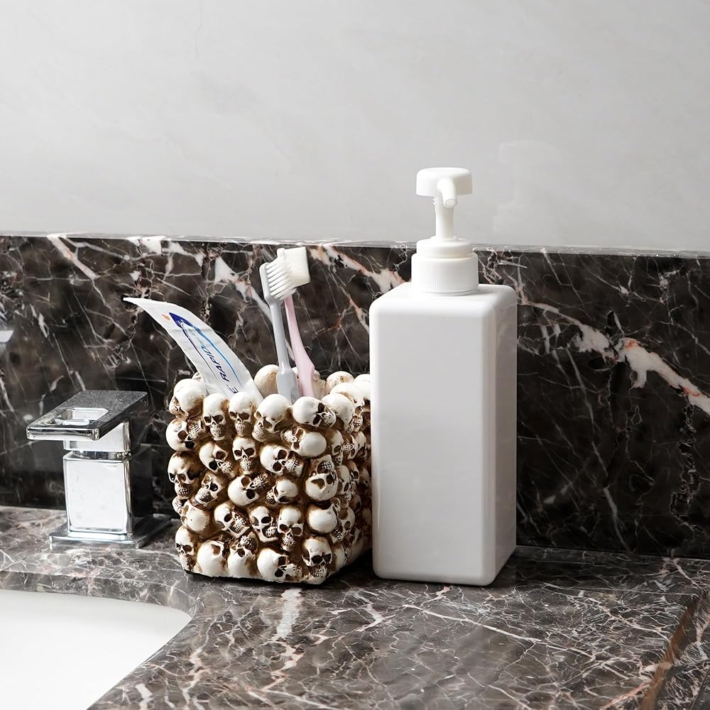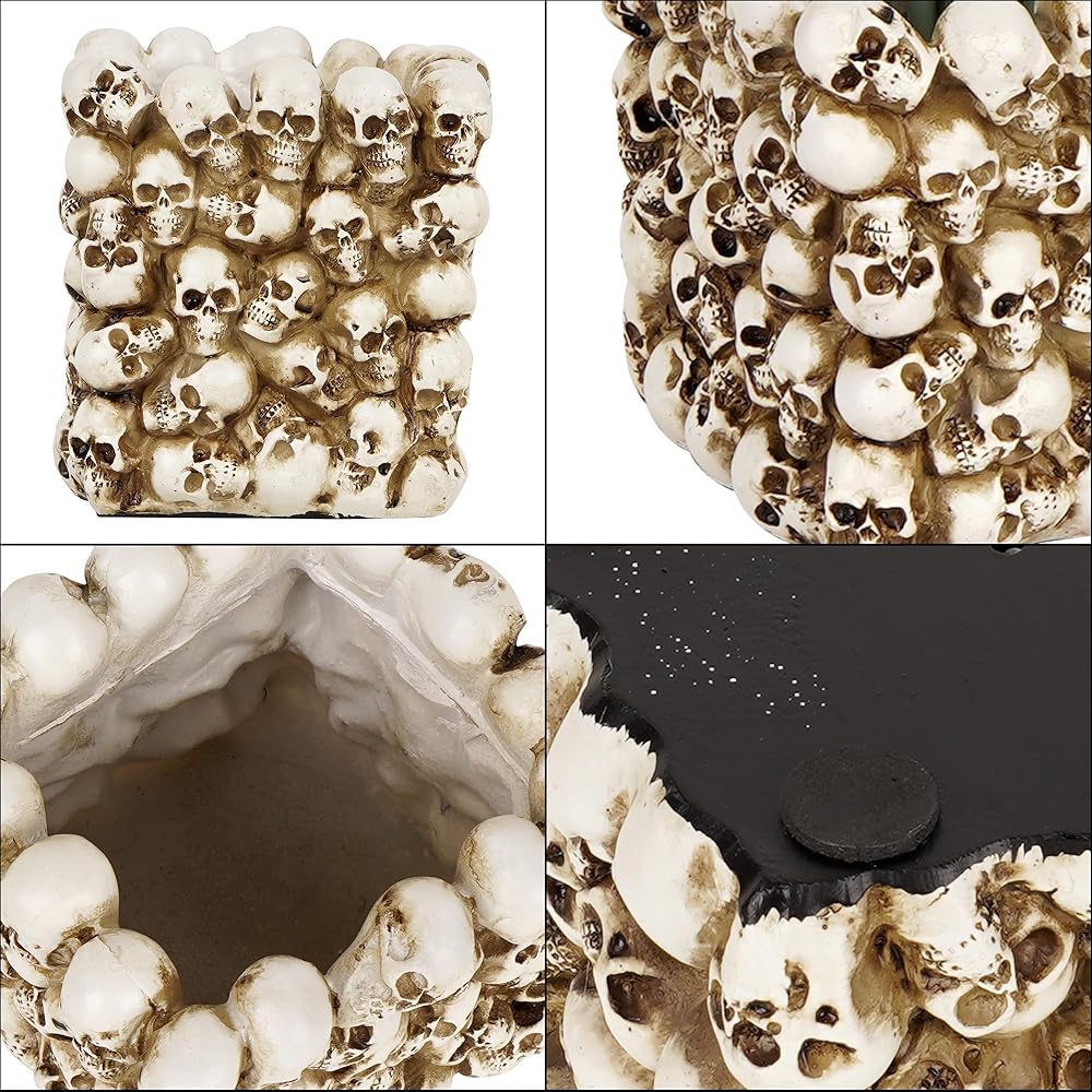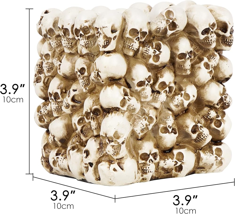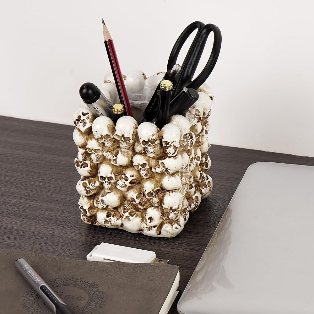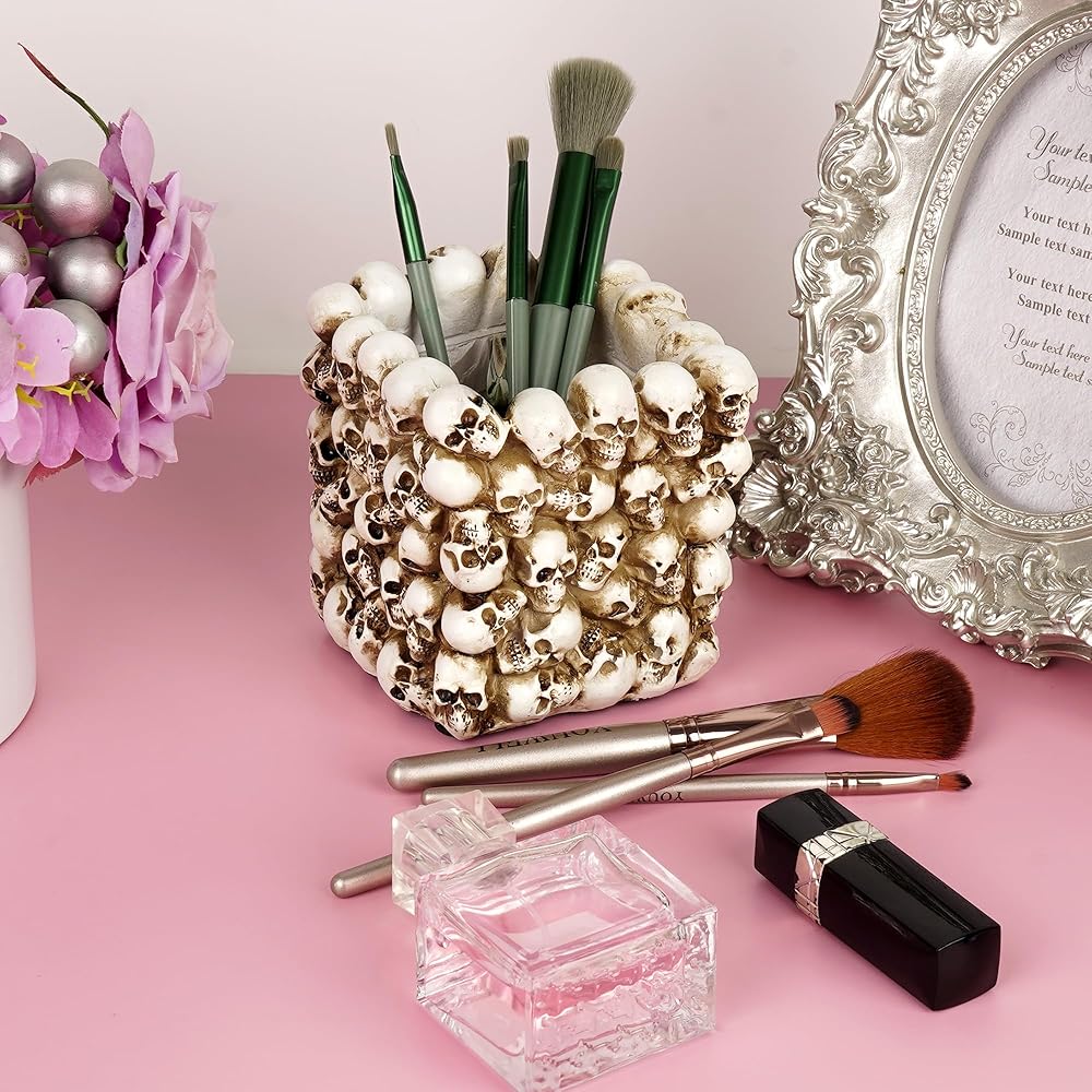 Add a pop of cuteness and fun to your space with this Cute Skull Wall Inspired Makeup Brush Holder, a versatile and eye-catching accessory that doubles as a cute pen holder, makeup brush organizer, or even a quirky planter. Made from high-density resin and beautifully hand-painted, this skull head holder shows vivid details and offers durability with a gothic flair. Great for a variety of uses, this skull holder caddy keeps your essentials like pens, pencils, makeup brushes, and toothbrushes neatly organized, bringing order and style to your desk, vanity, or bathroom countertop. Its creative design provides a fun way to display tiny succulents or small cacti, adding a playful yet eerie vibe to your surroundings. A fun addition to your goth or skull collection, this 3D carved wall of skull decor piece makes a standout statement on your desktop, sideboard, bookshelf, or dresser. It also serves as a fun gift for loved ones who enjoy gothic, skull things, making it a cool present for birthdays, holidays, or other special occasions.