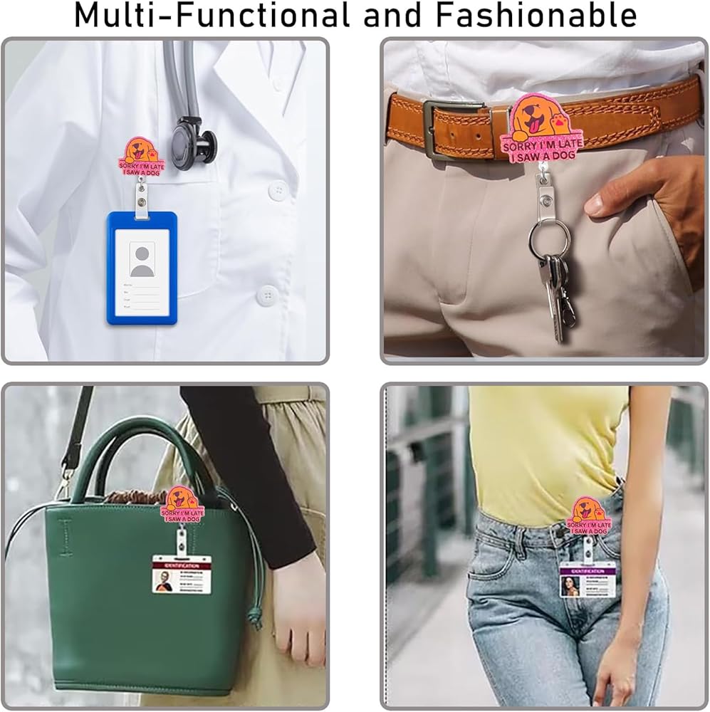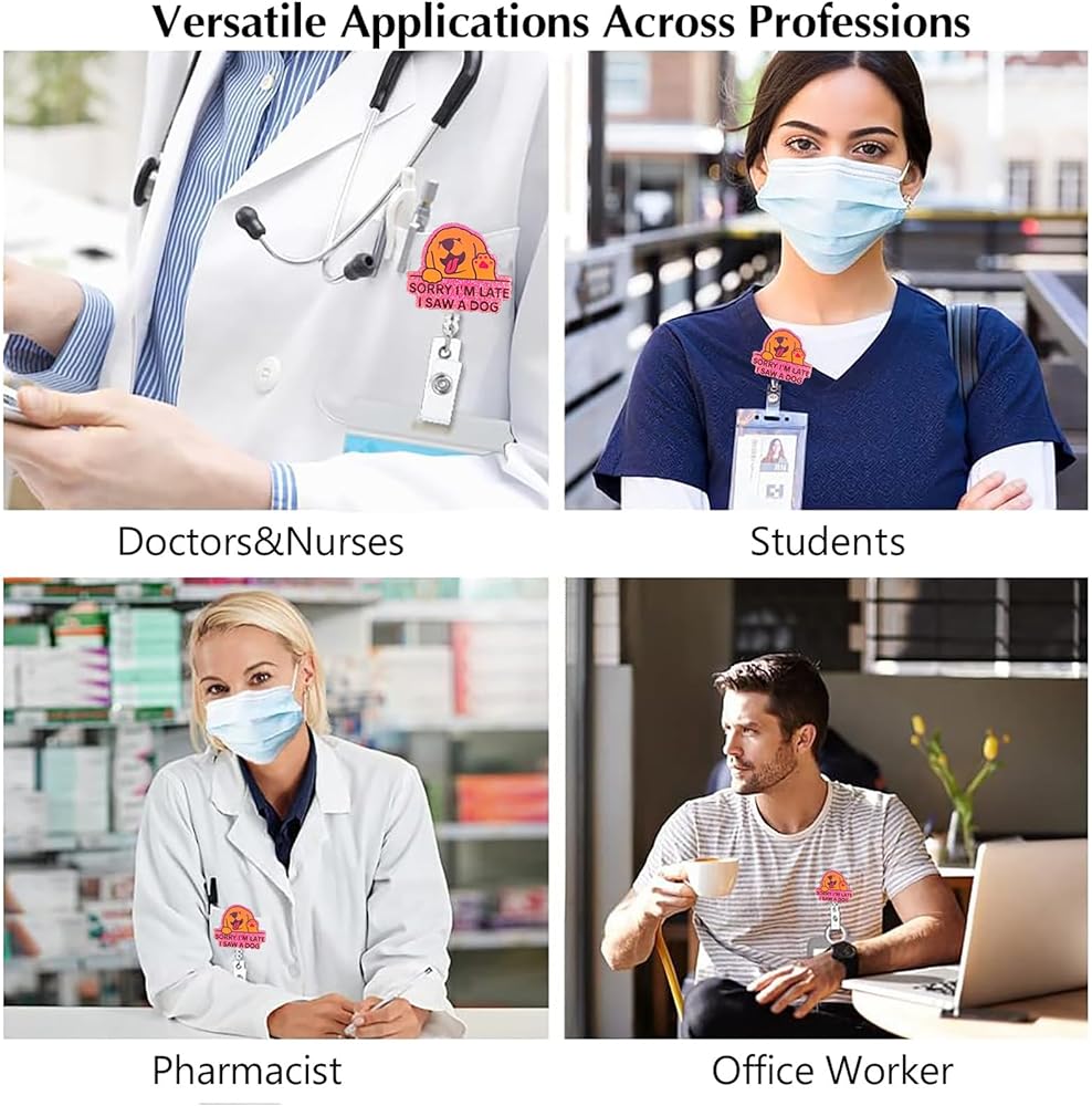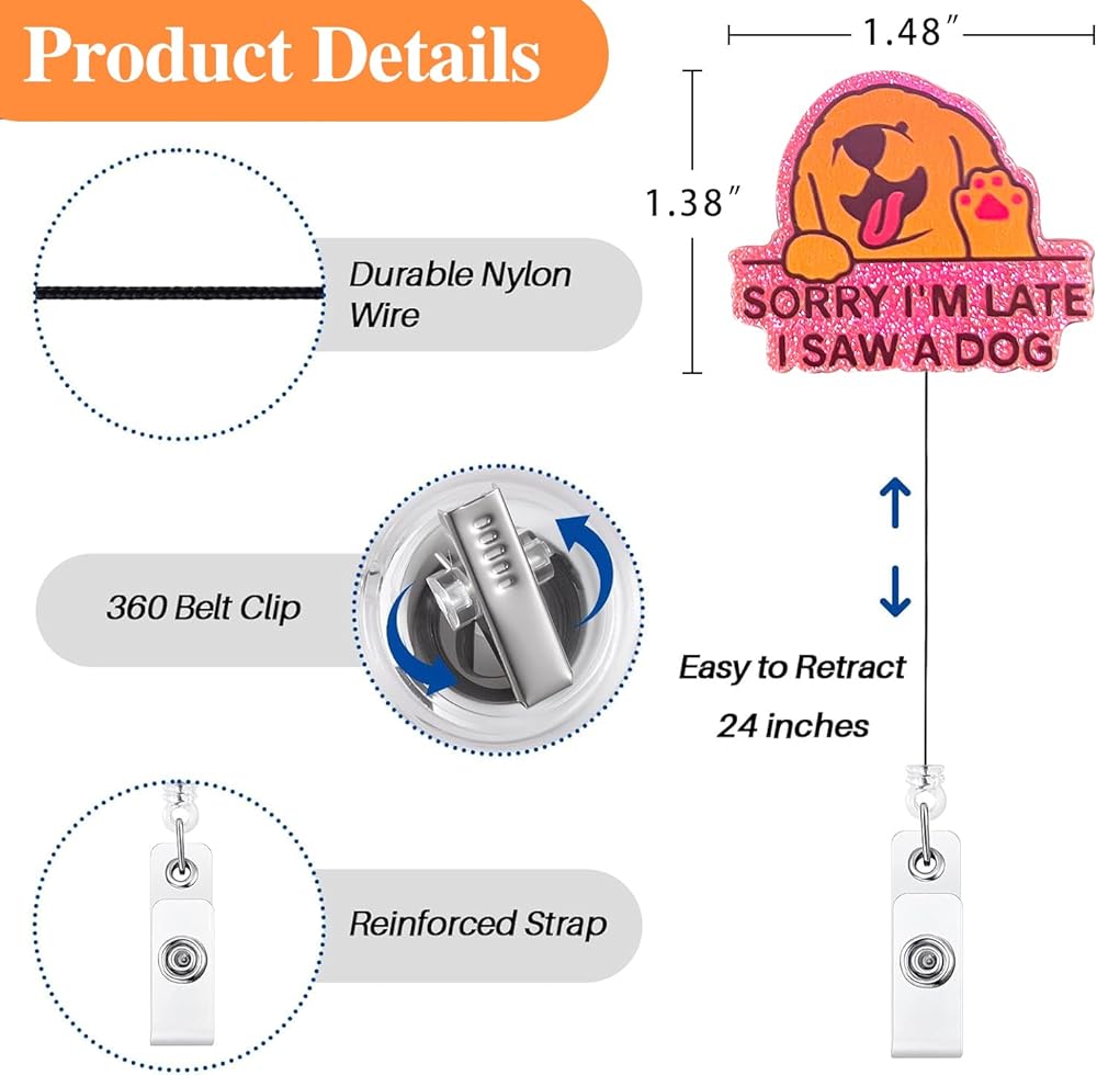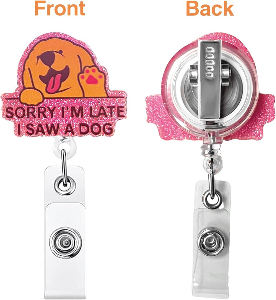 Christmas Badge Reels Retractable: Sorry I'm late I saw a dog badge reels is made of shiny acrylic, and its unique design makes it delicate and cute, resistant to fading, and lightweight to wear. Glued to its back is a retractable badge reel with alligator clip, which is made of high quality ABS material