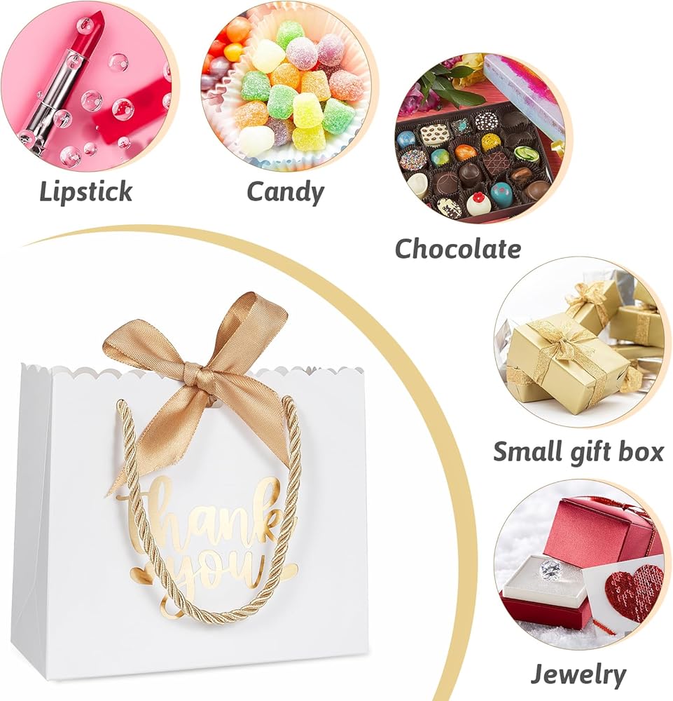 حقائب هدايا صغيرة: 50 عبوة من أكياس الهدايا الصغيرة مع 50 قطعة شريط ذهبي و100 قطعة من المقابض الذهبية، حجم صغير: 4.7 بوصة ارتفاع × 5.5 بوصة طول × 2.5 بوصة عرض، هذه الحقائب الورقية الصغيرة مثالية للهدايا الصغيرة، مثل العطور وأحمر الشفاه ، العسل، الشوكولاتة، الشموع المعطرة