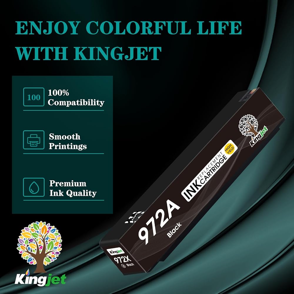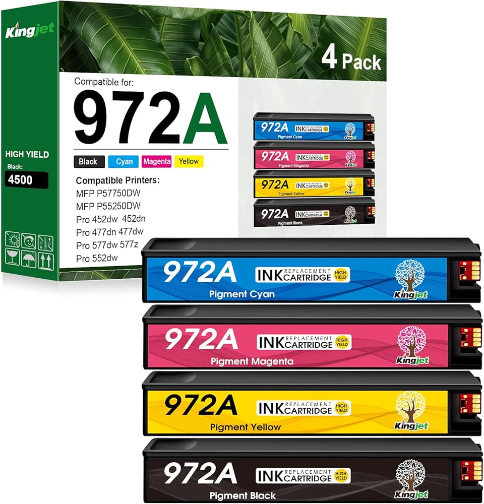 مجموعة خراطيش الحبر Kingjet 972A البديلة لخراطيش الحبر HP 972A 972X 972 تعمل مع PageWide 377dw PageWide Pro 477DW 477DN 577DW 577z 552DW 452DN 452DW 352DW P55250DW P57750DW، 4 عبوات