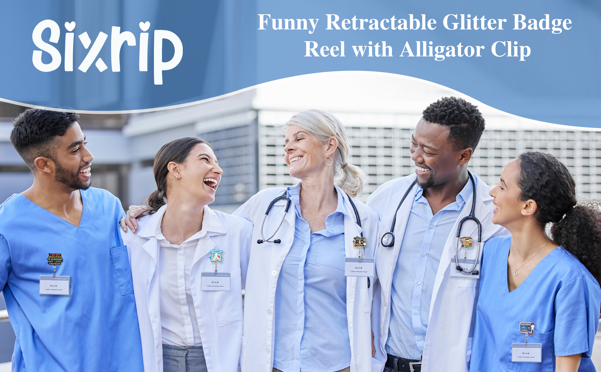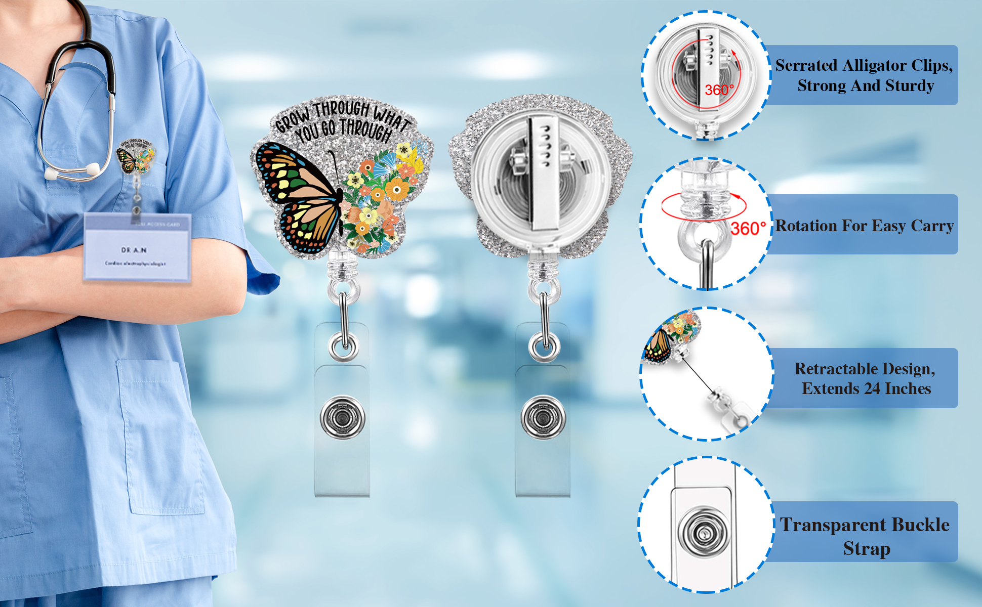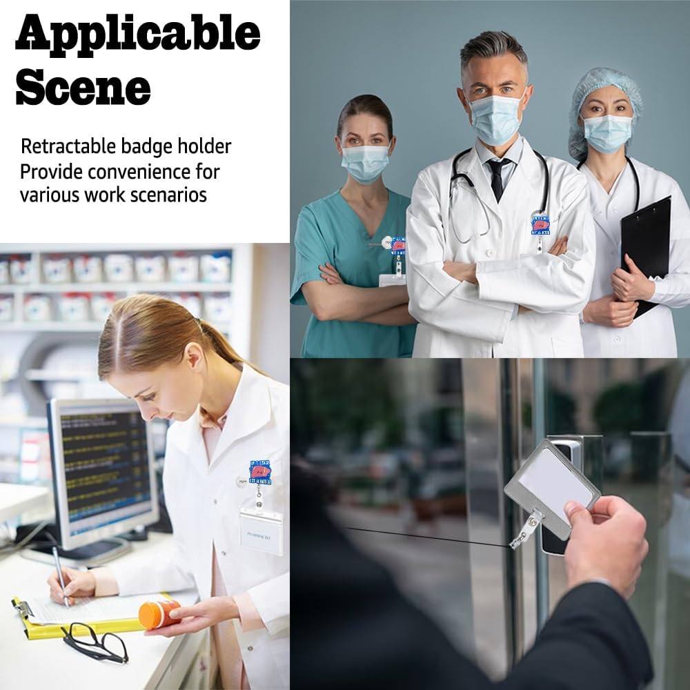 مادة فاخرة: بكرة الشارة مصنوعة من مادة أكريلونتريل بوتادين ستايرين عالية الجودة، ومشابك التمساح وحبل النايلون، ولوح أكريليك لامع، وتضمن الأمان والموثوقية، مع مشابك التمساح المسننة، لن تسقط بطاقة الهوية الخاصة بك أبدًا، مادة قوية، مقاومة الخدوش والكسور ويضمن تحمل بيئات العمل القاسية، مما يجعله الخيار الأفضل للعاملين في المجال الطبي.