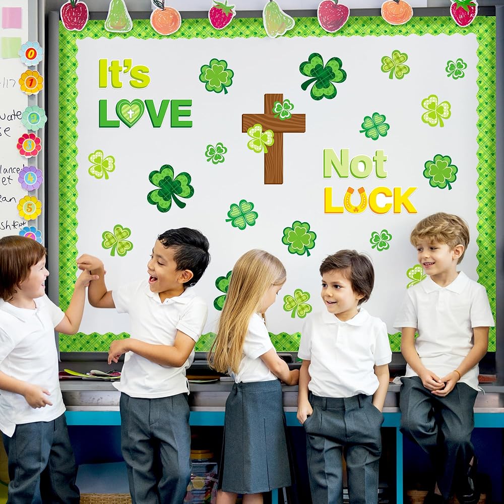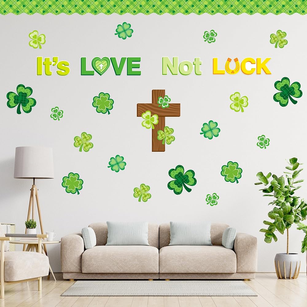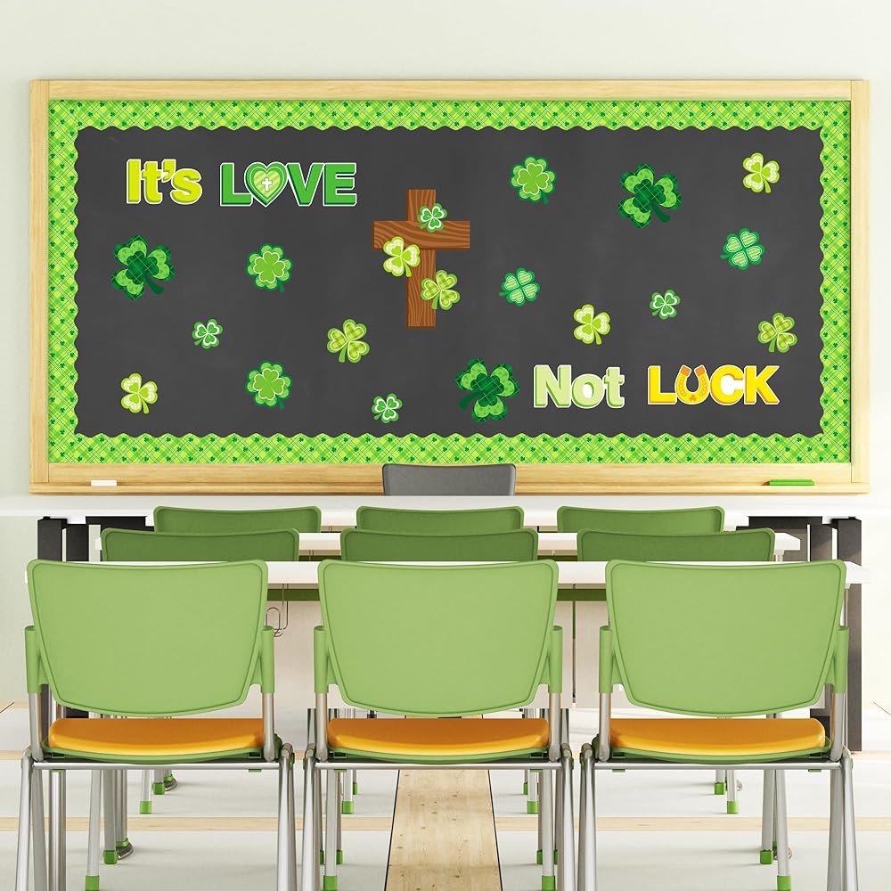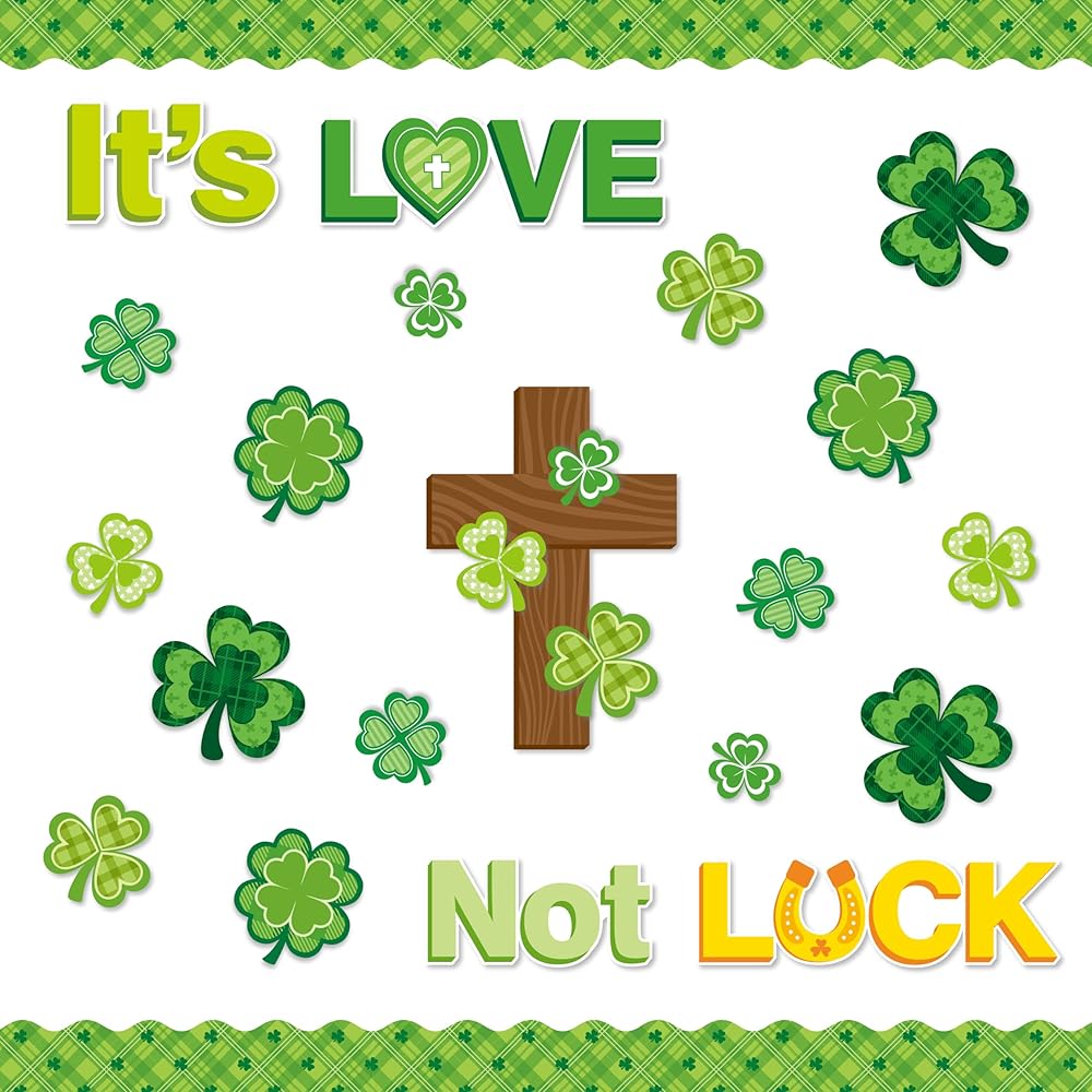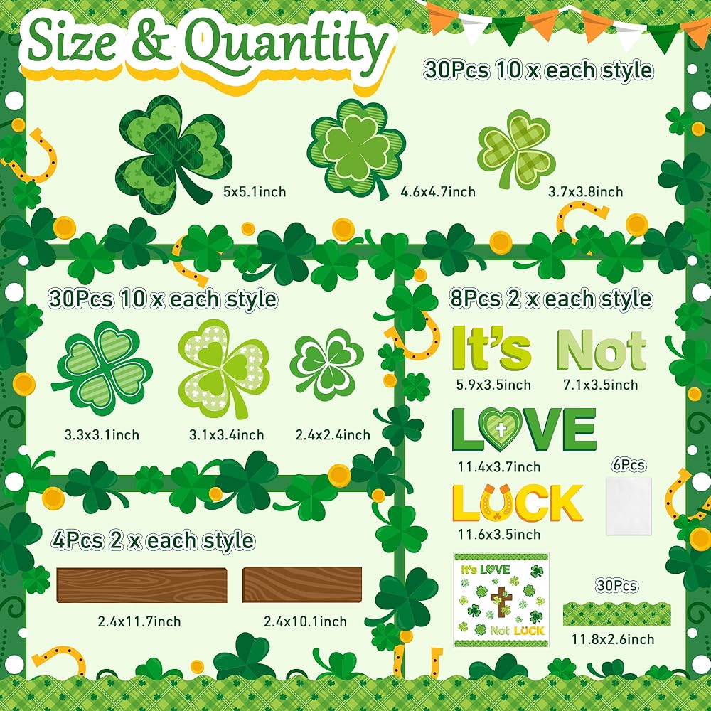 نمط شامروك: تتم طباعة هذه القطع من لوحة الإعلانات التي تحمل عنوان عيد القديس باتريك بأحرف "إنه الحب وليس الحظ" وغيرها من زخارف عيد القديس باتريك مثل نبات النفل والصلبان، مثالية لتزيين لوحات الإعلانات في الفصول المدرسية أو في المنزل لخلق جو من الأمل والحب في عيد القديس باتريك.