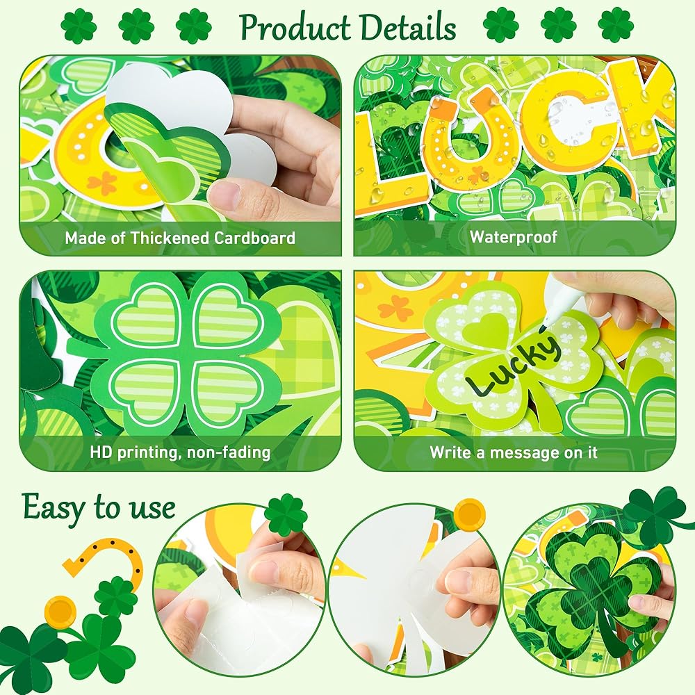 تشمل العبوة: سوف تحصل على 2 حرف واحد فقط "It's love not Lucky" و2 قطع كبيرة بنمط متقاطع. يوجد أيضًا 6 قطع مختلفة بنمط نبات النفل، 3 كبيرة و3 صغيرة، كل منها يحتوي على 10 أوراق، بالإضافة إلى 30 شريطًا زخرفيًا منقوشًا أخضر، و6 أوراق من الملصقات المنقطة وورقة واحدة من الورق المؤثر. هذه المواد وفيرة وتم تجميعها بشكل جميل للفصول الدراسية أو ديكور المنزل أو ديكور حفلة عيد القديس باتريك.