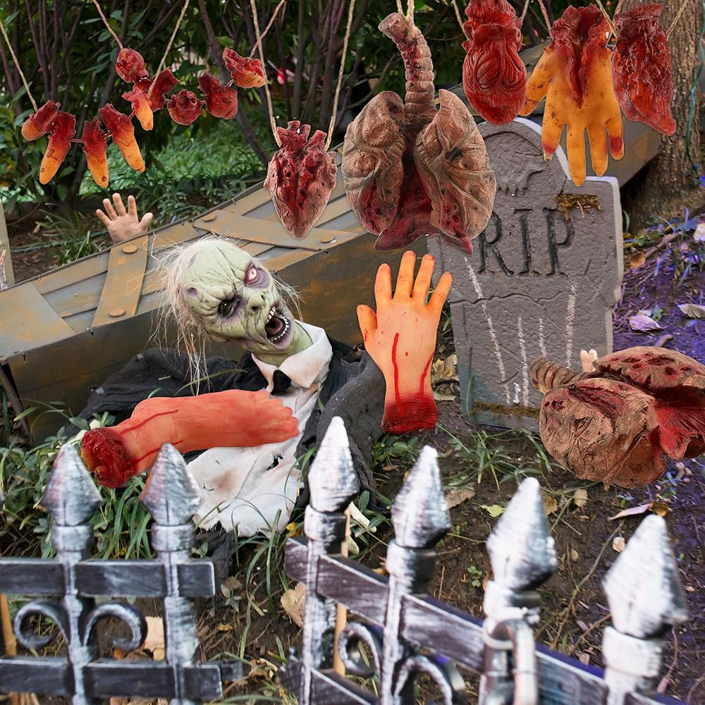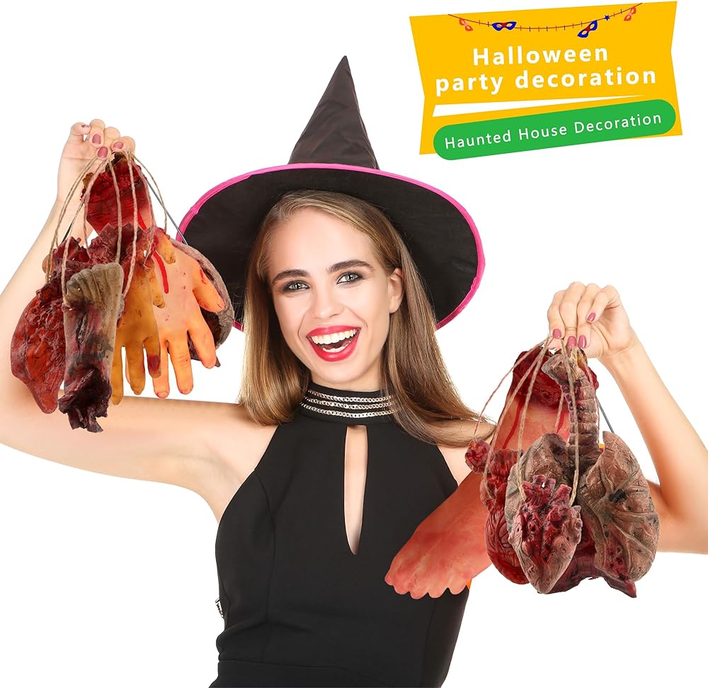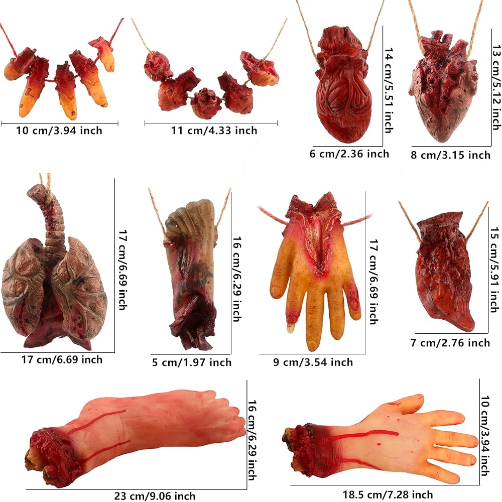 the fake body parts are great for Halloween party, fancy dress parties, haunted houses decorations, spoof trick props, horror theme party and more, body parts with twine can be hung on walls, doors, windows, ceilings, and trees, the bloody hands and feet without string can be placed on dining tables and closets, decorating a creepy Halloween party scene