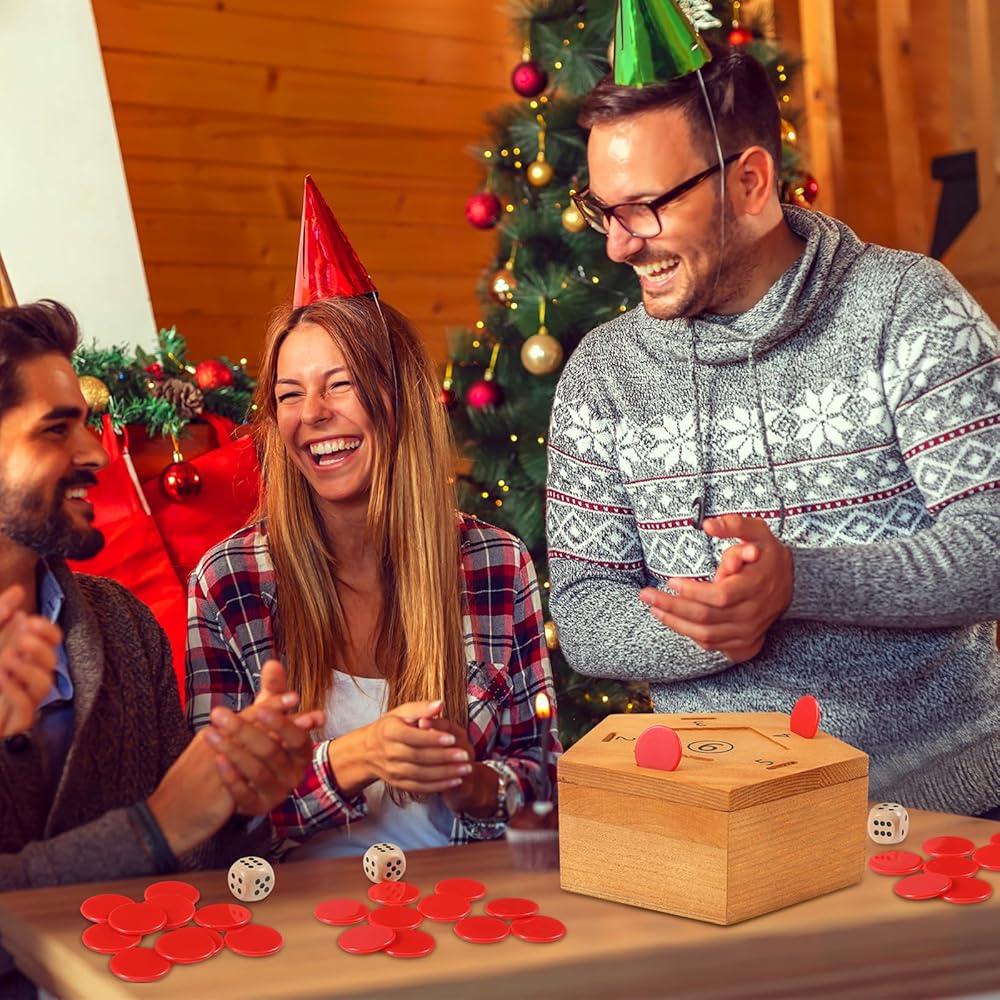 Captivating visually, the coin game wood box boasts a natural wood color, contrasted by bold, festive red plastic coins. Vibrantly colored pieces not only add to the festive spirit but also facilitate easy visibility during game play.