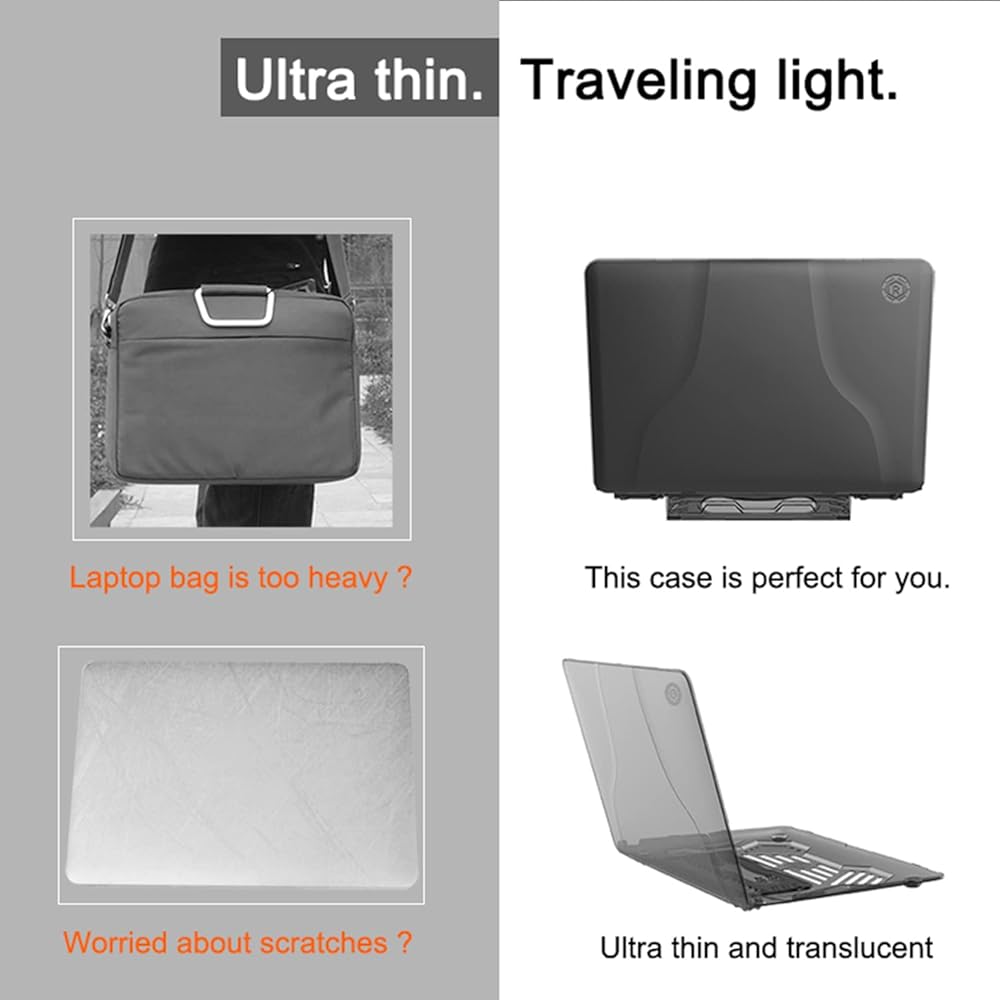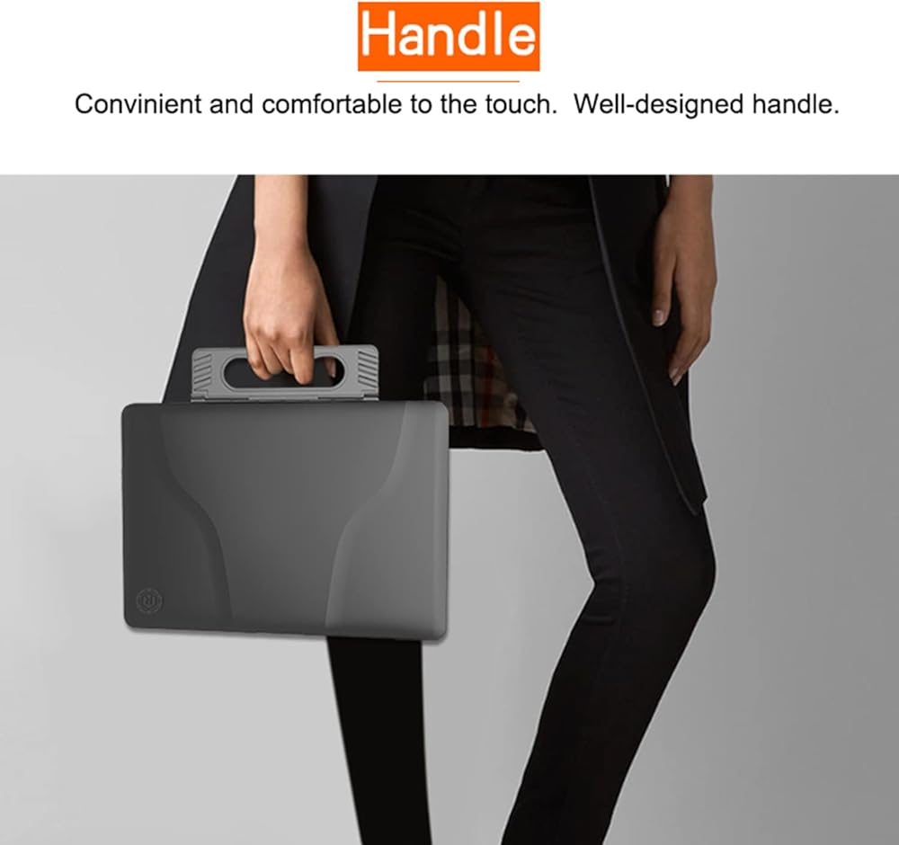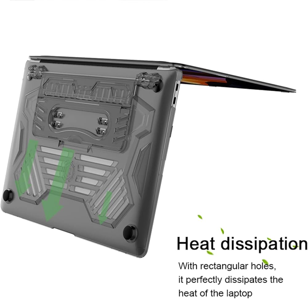 حافظة بلاستيكية صلبة غير لامعة عالية الجودة لحماية جهاز MacBook الخاص بك من بصمات الأصابع والصدمات والخدوش وما إلى ذلك، يحمل الجزء السفلي حاملًا قابلاً للتجميع يضبط جهاز MacBook الخاص بك على الزاوية المناسبة للعمل واللعب وما إلى ذلك، والذي يعمل أيضًا كمقبض قوي.