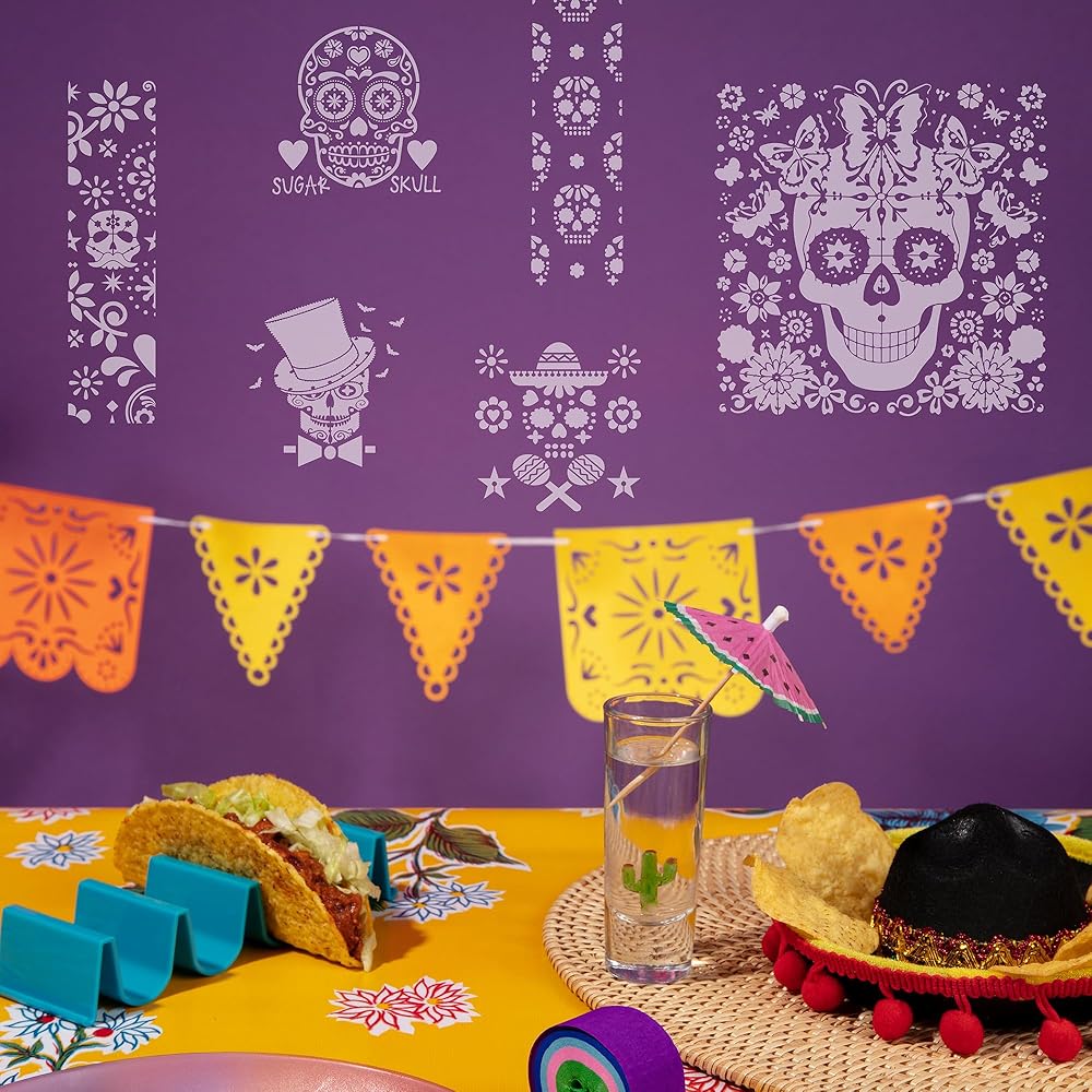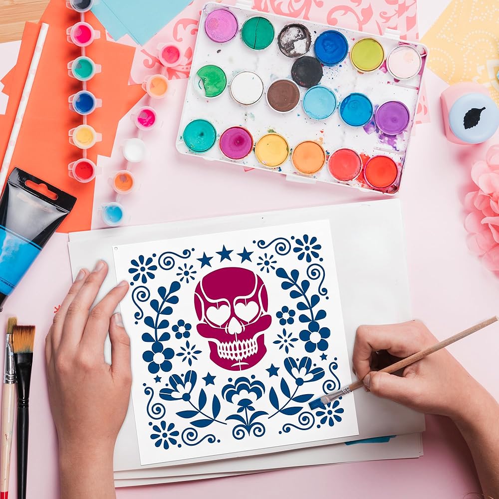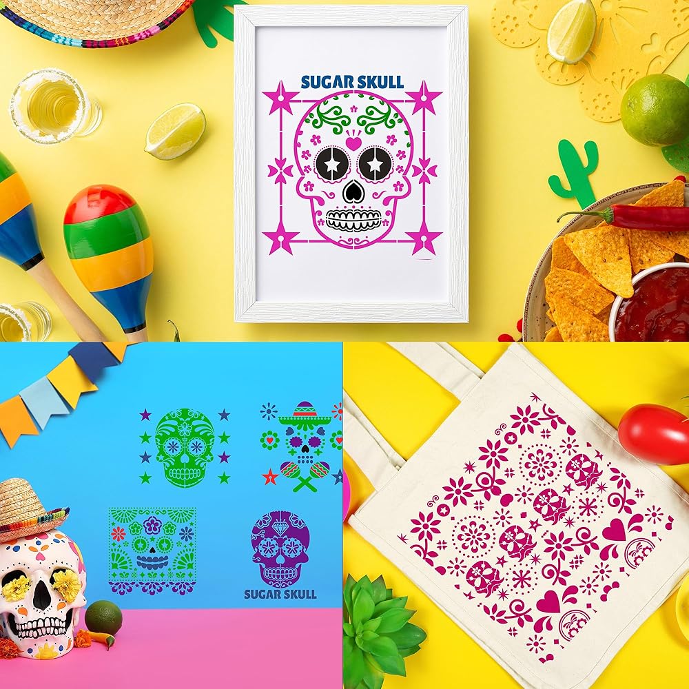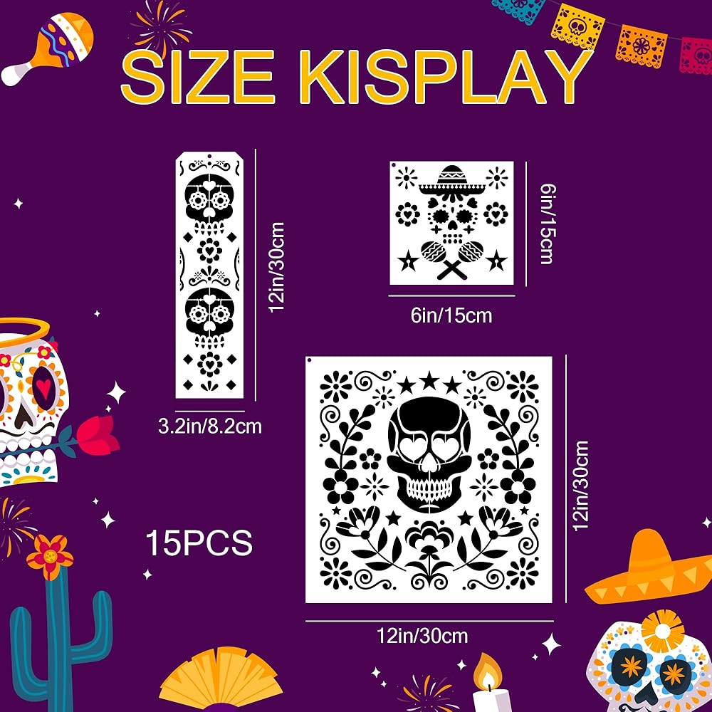 قالب استنسل رسم جماجم السكر - 15 قطعة يوم الموتى جماجم السكر الزهرية، أنماط الرموز التقليدية، مجموعة قوالب رسم استنسل DIY لملابس الطاولة الخشبية، تي شيرت رسم يدوي