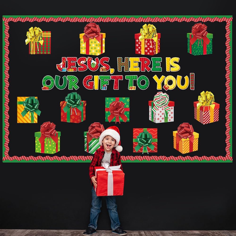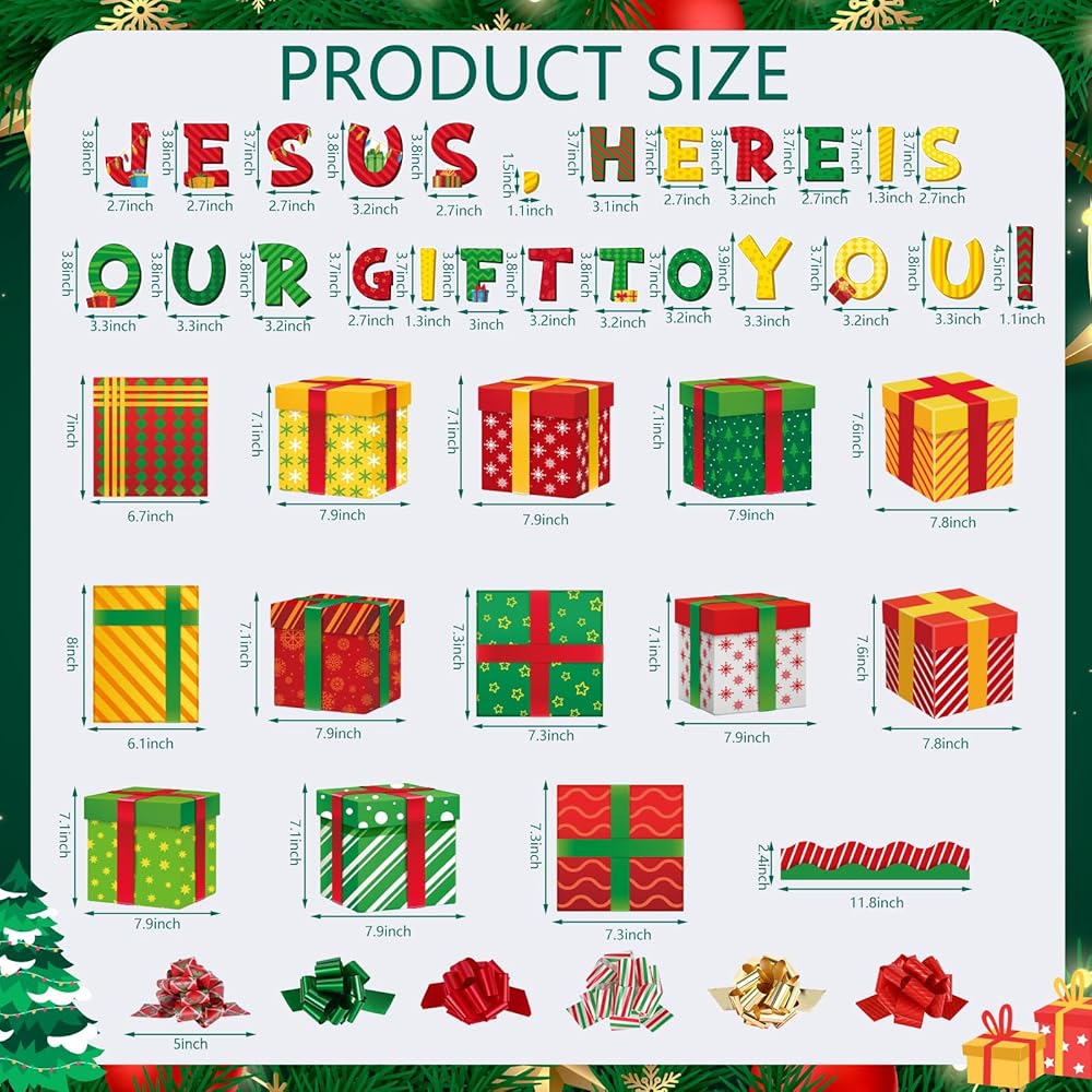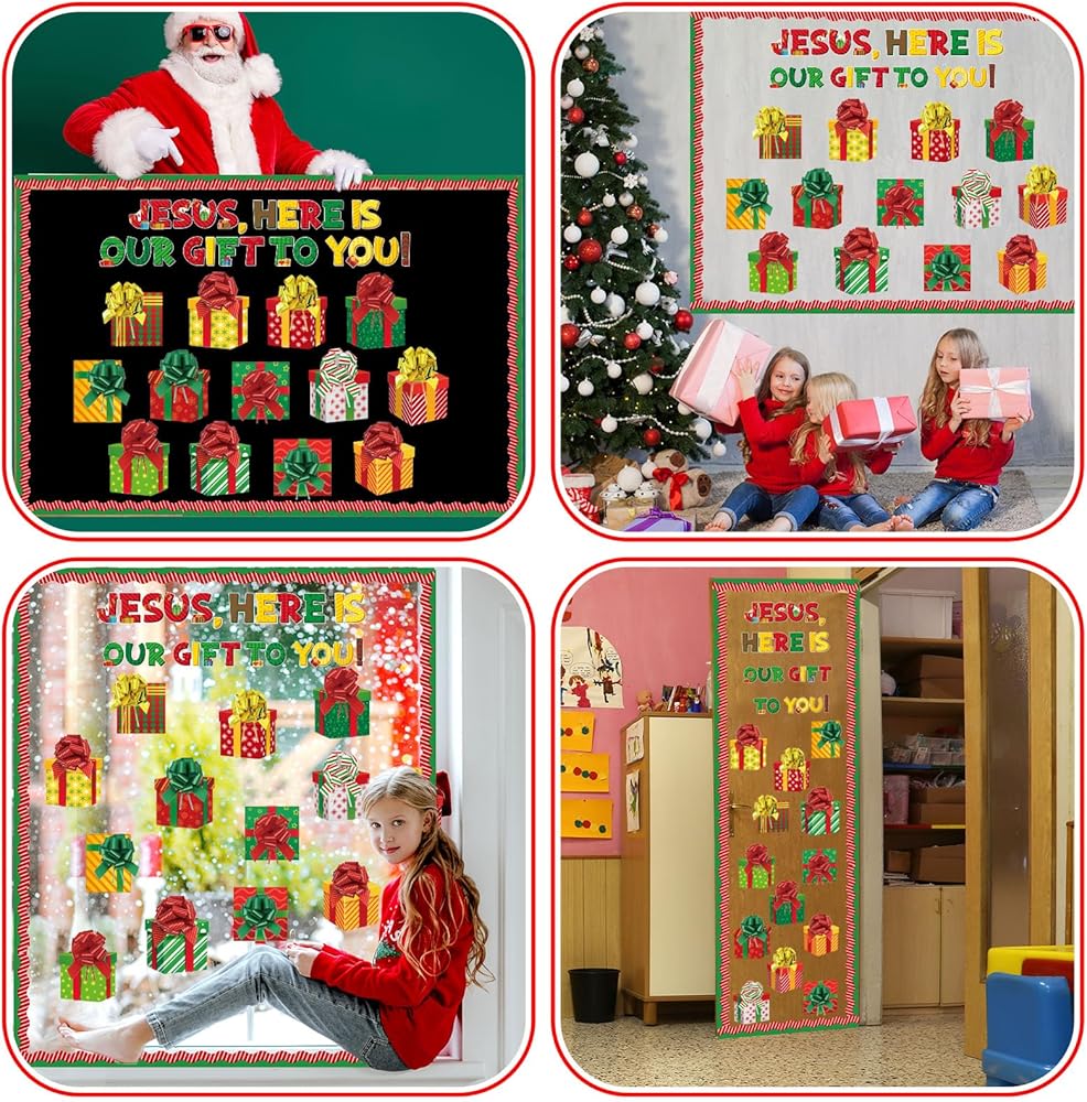 • Package Includes: you will receive 69 pieces of Jesus bulletin board decorations set, including 25 phrase cutouts[JESUS, HERE IS OUR GIFT TO YOU], 13 Xmas gift boxes cutouts, 13 pull bow ribbons, and 18 borders, come with 80 adhesive dots