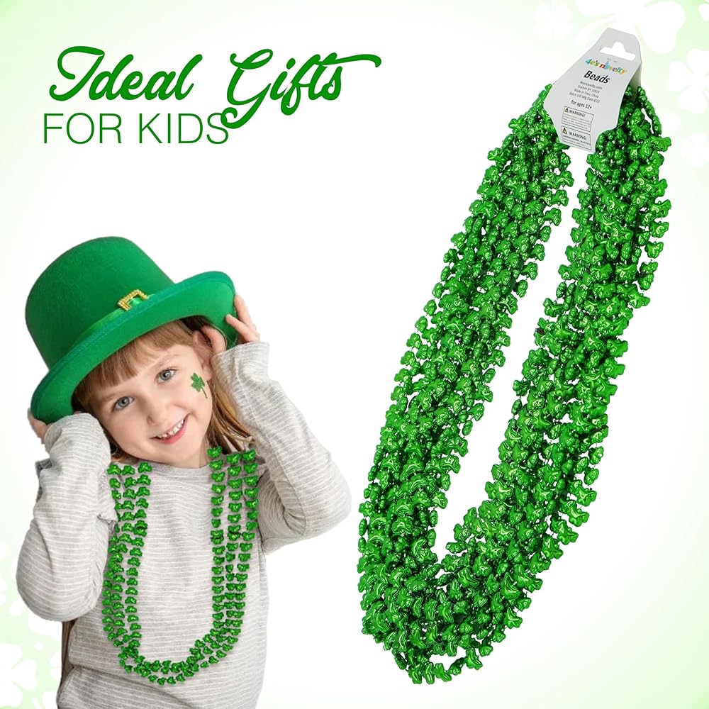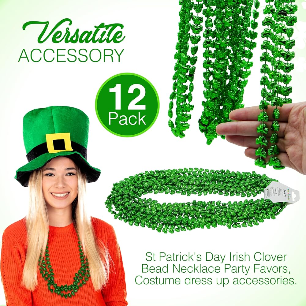 مجموعة قلادة خرز عيد القديس باتريك الجديدة من 4E (عبوة من 12 قطعة) خرز أخضر شامروك البرسيم - هدايا عيد القديس باتريك للأطفال، لوازم حفلات الأطفال وإكسسوارات الأزياء