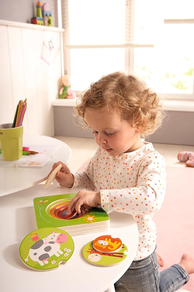 Say hello to your friends on the farm! Children have beastly fun with this wooden puzzle and learn to recognize colours and dimensions at the same time. The puzzle pieces are fitted in the puzzle board notches according to size. At the end there's just one piece missing to finish off a big puzzle. But up until that point you need patience., endurance and concentration. Because the start can be a little tricky, we at HABA have developed puzzles that make starting out easy for the littlest ones. The older children get, the more they look for new challenges - and find them in the varied HABA cardboard puzzles, with more pieces and an increasing level of difficulty.