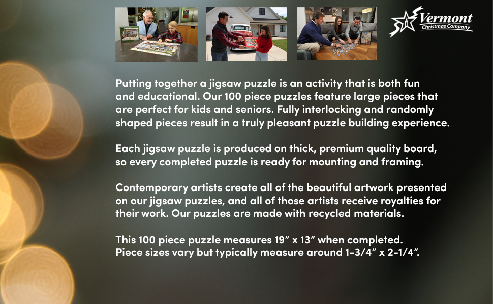 - ضمان القطعة: إذا أكملت لغزك وتعتقد أن قطعة مفقودة أو مفقودة، فما عليك سوى الاتصال بشركة Vermont Christmas Company للحصول على قطعة بديلة.