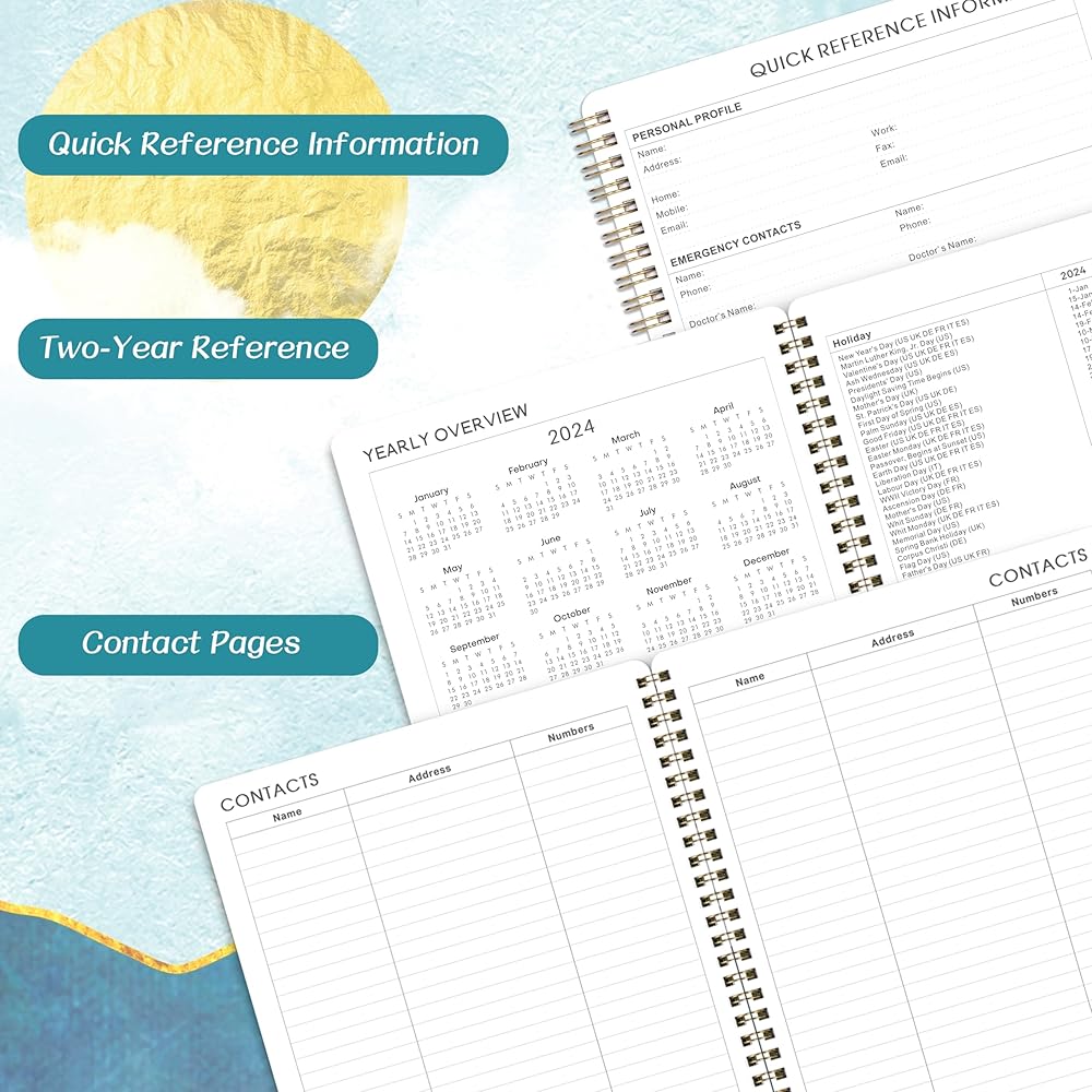🌲 تصميم محتوى احترافي - يتضمن هذا المخطط 2024-2025 12 شهرًا من الصفحات الشهرية مع مرجع شهري سابق ومستقبل + 12 شهرًا من الصفحات الأسبوعية المبطنة الواسعة + نظرة عامة على التقويم 2024-2026 + صفحات العطلات 2024-2026 + صفحتين للاتصال. التركيز على تلبية جميع احتياجاتك.