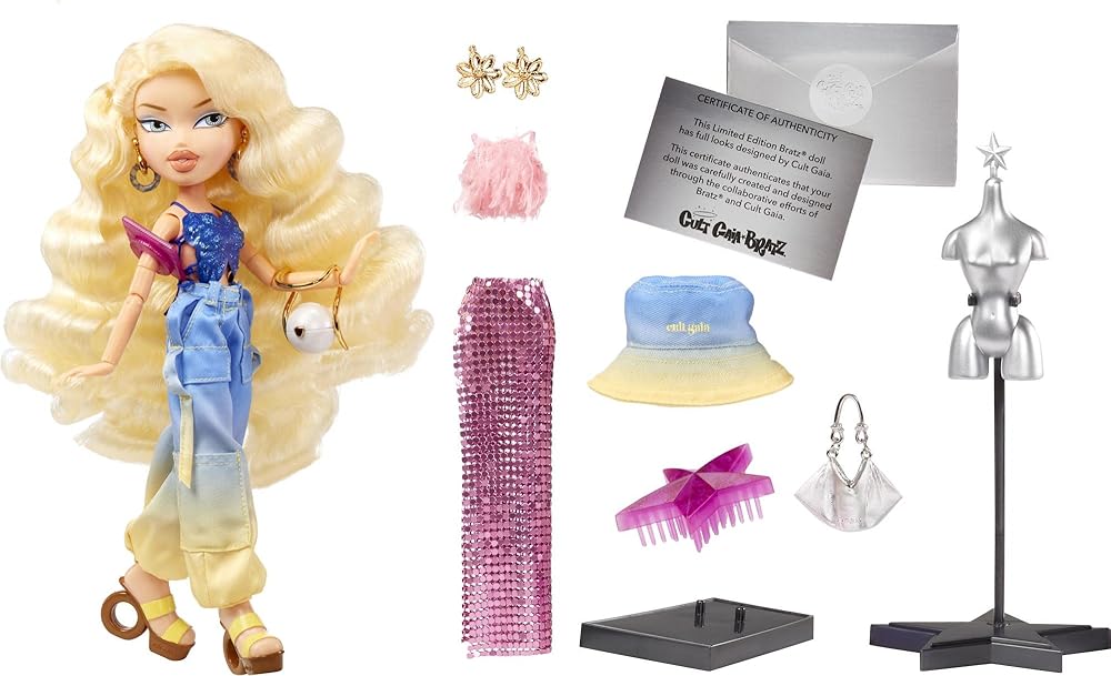 The girls with a passion for fashion are wearing Cult Gaia, the Los Angeles-based lifestyle brand known for creating objets d'art that will live in your closet forever. Cult Gaia founder & Creative Director Jasmin Larian not only grew up with Bratz®, but was part of its inception from a young age. Bratz® laid the foundation for her to learn about fashion design, self-expression, and creativity, which inspired her to find her voice and create Cult Gaia. Collectors and new Bratz® fans can collect this all-new, premium, and limited edition fashion doll. Cloe wears a blue butterfly 'Parvana' inspired top with glitter, ombré blue and yellow 'Wynn' cargo pants, staple 'Remi' platform shoes, 2 geometric bangle bracelets, gold and blue stone earrings, and artful 'Pearl' bag. She also comes with a pink 'Joey' feather top, pink metal mesh full length skirt, ombré blue and yellow bucket hat, iconic silver 'Hera' shoulder bag and gold 'Bloom' earrings. Cloe has a fully articulated body and comes with a stand to display her on and a dress form to display her second outfit. The premium geometric trapezoid box has a foil finish, arched display window, glam character art and molded Bratz chain handle. Collect both Cloe & Yasmin from the Bratz x Cult Gaia Designer collection— the girls got dressed in Los Angeles, styled by Jasmin Larian in her favorite looks!