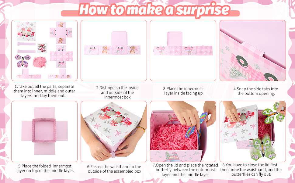تصميم فريد: يتميز صندوق الهدايا الوردي الأنيق بطباعة على شكل عيد الميلاد، مزينة برقائق الثلج، مثل قزمين مع القبعات، والسيارات الوردية، ودمى الدب، وأشجار عيد الميلاد، والأجراس، وندفات الثلج، وصناديق الهدايا، وما إلى ذلك. وسط صندوق الهدايا يوفر لك مساحة كبيرة حيث يمكنك وضع كعكة صغيرة حلوة، وحلويات رائعة، وكرات زجاجية لامعة، وزهور أبدية جميلة، ودمى صغيرة لطيفة، إلخ. صندوق هدايا رائع لتقديم الهدايا