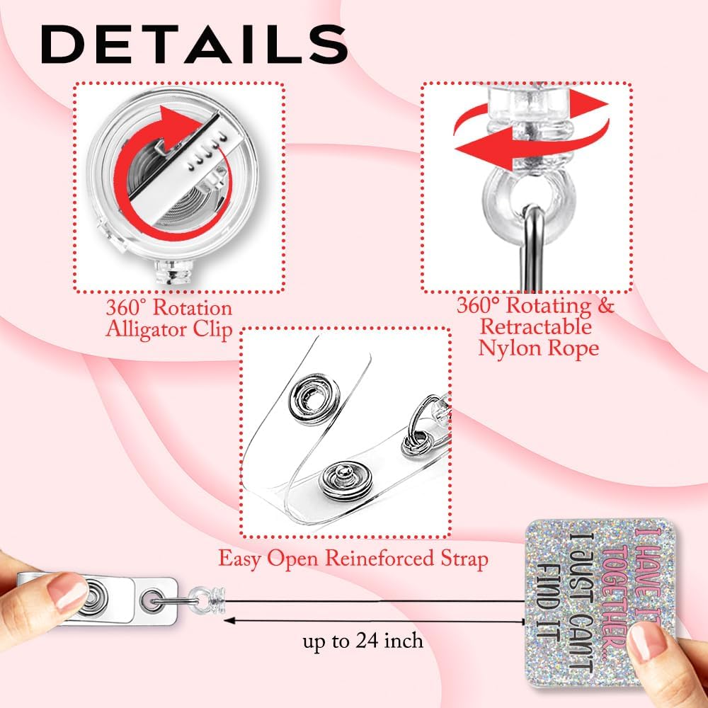 Cute and Convenience:Our retractable badge holder with glitter, and each pattern is carefully designed by us to be fun and personalized. The quantity is sufficient for daily use, replacement and will not be repeated. The 360° rotating alligator clip allows you to wear it easily from any angle while keeping your badge facing forward.