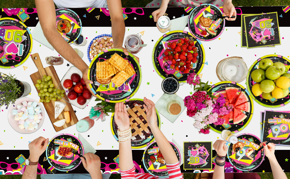 مادة فاخرة - لوازم الحفلات ذات طابع التسعينيات مصنوعة من ورق عالي الجودة آمن ومتين، لتوفر لك حفلة مليئة بأجواء التسعينيات. يقلل الورق القابل للتصرف من وقت التنظيف حتى تتمكن من الاستمتاع بمزيد من الوقت مع الأصدقاء والعائلة في حفلة بطابع التسعينيات.