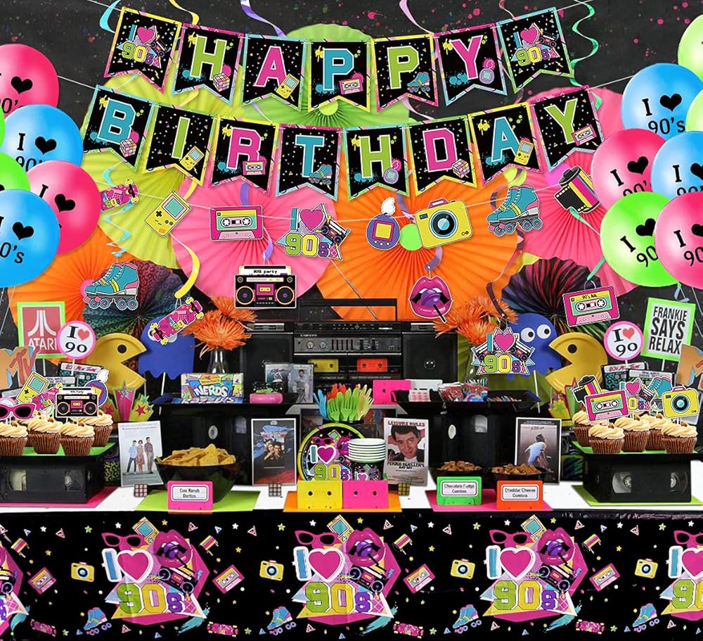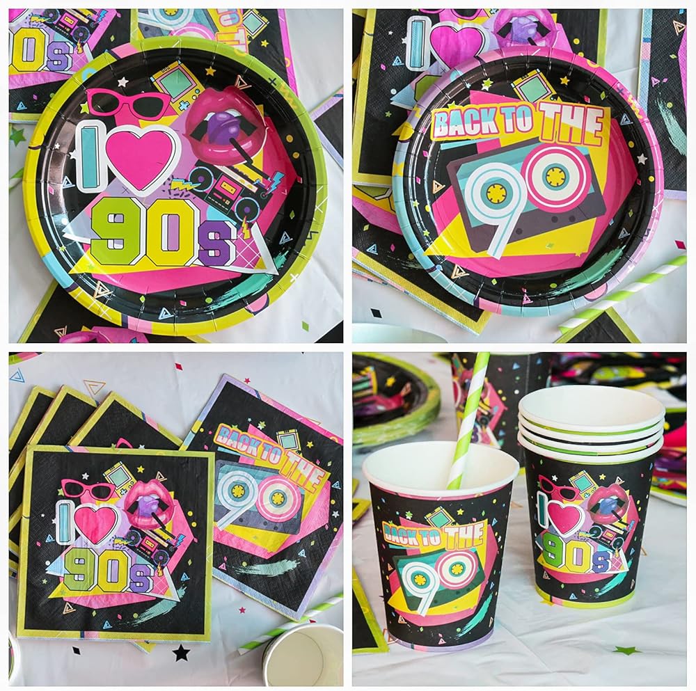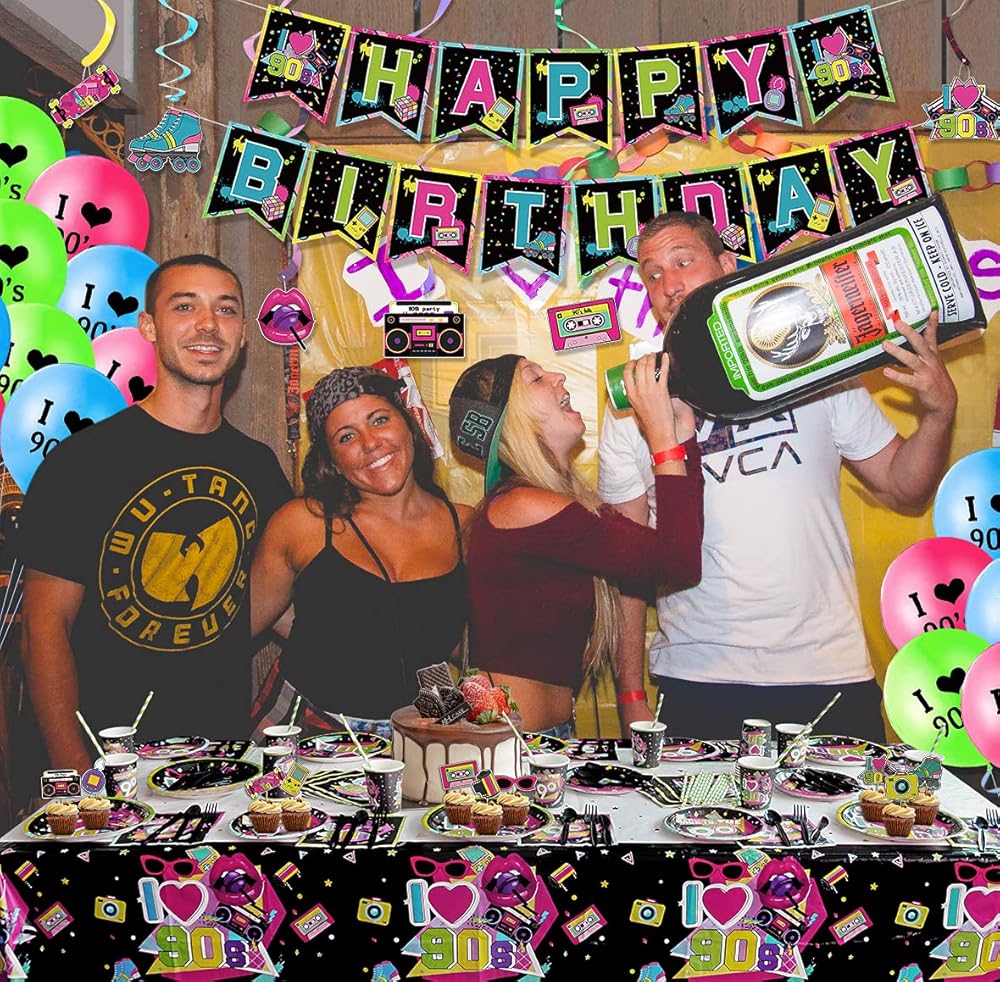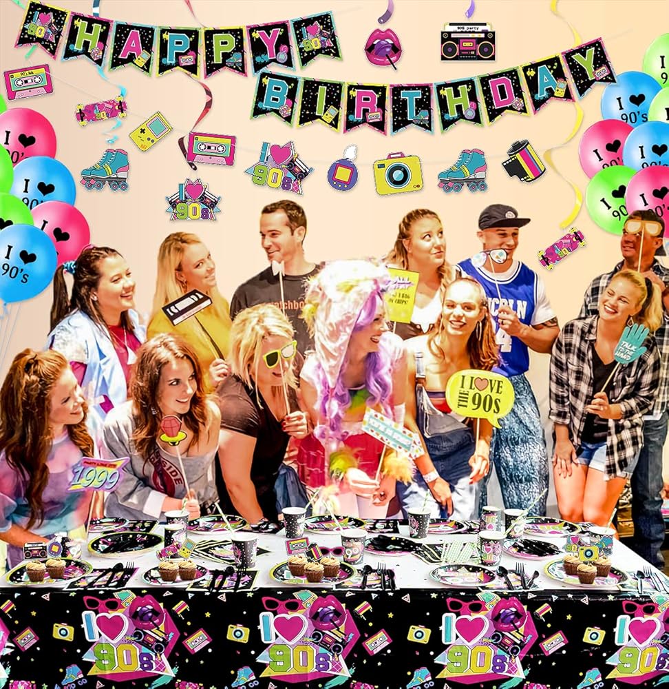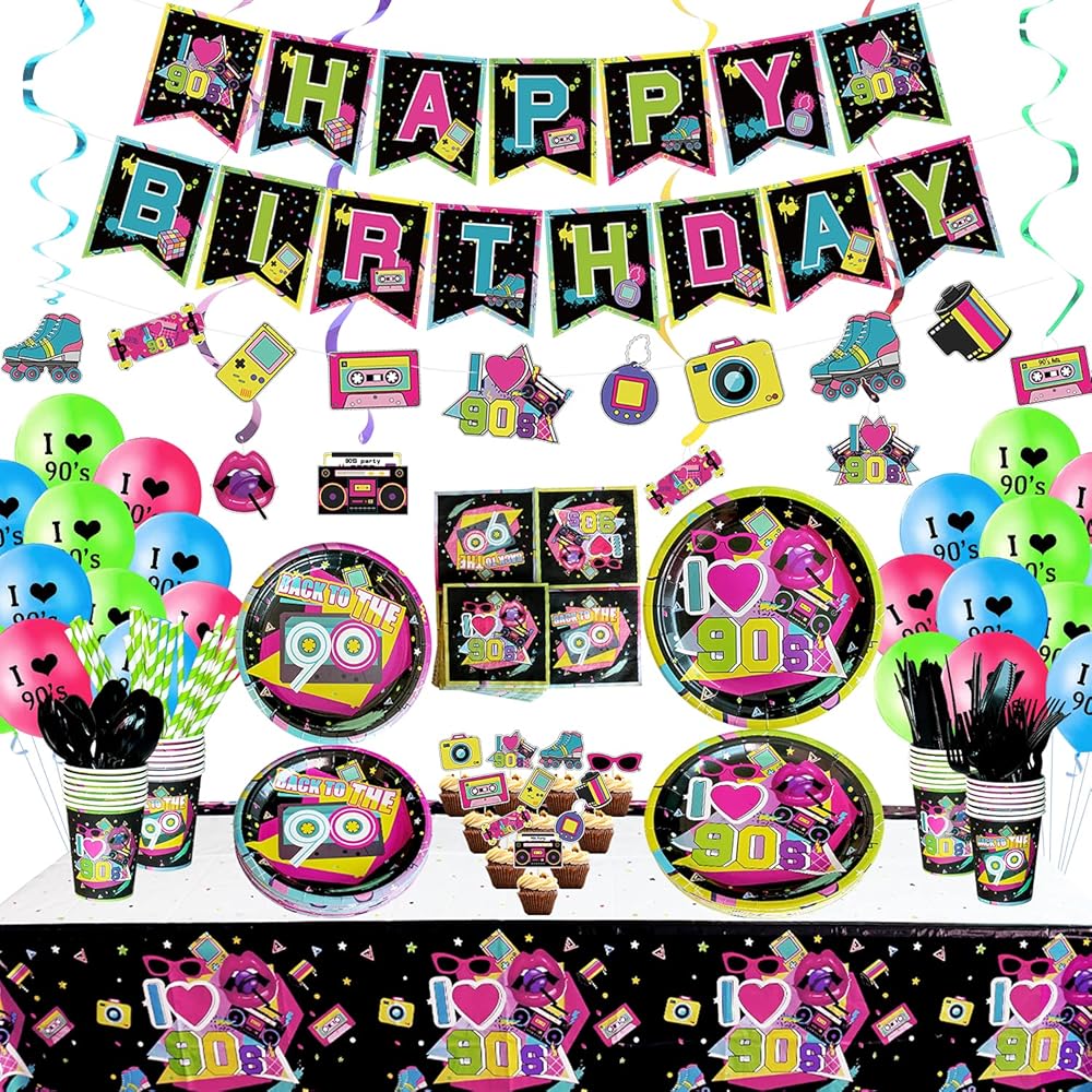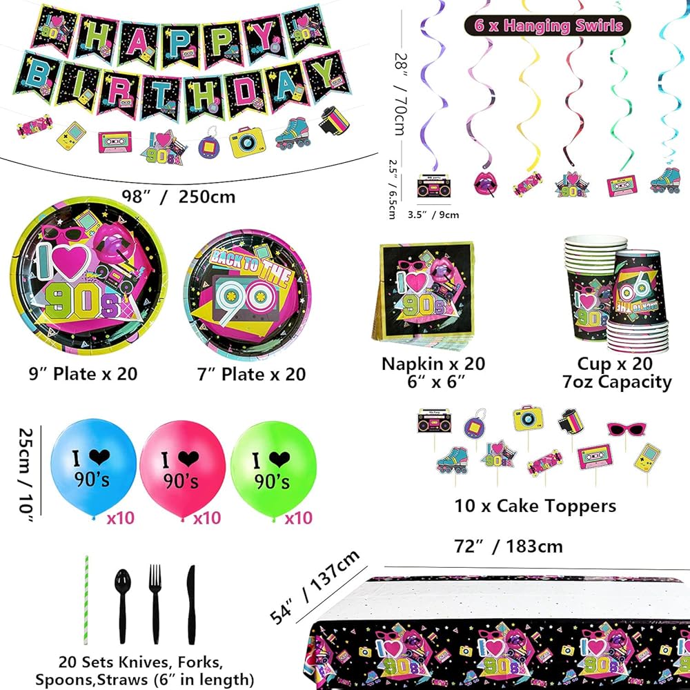 لوازم حفلات التسعينيات - مجموعة ديكورات حفلات العودة إلى التسعينيات، بما في ذلك لافتة عيد ميلاد سعيد، ودوامات معلقة، ورايات عناصر التسعينيات، والأطباق، والأكواب، والمناديل، وأدوات المائدة، ومفارش المائدة، والبالونات - تكفي 20 شخصًا