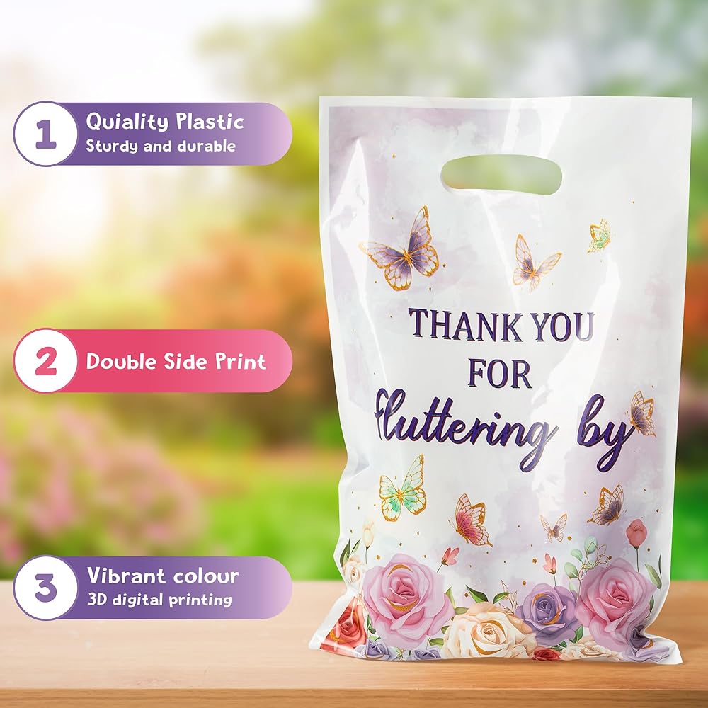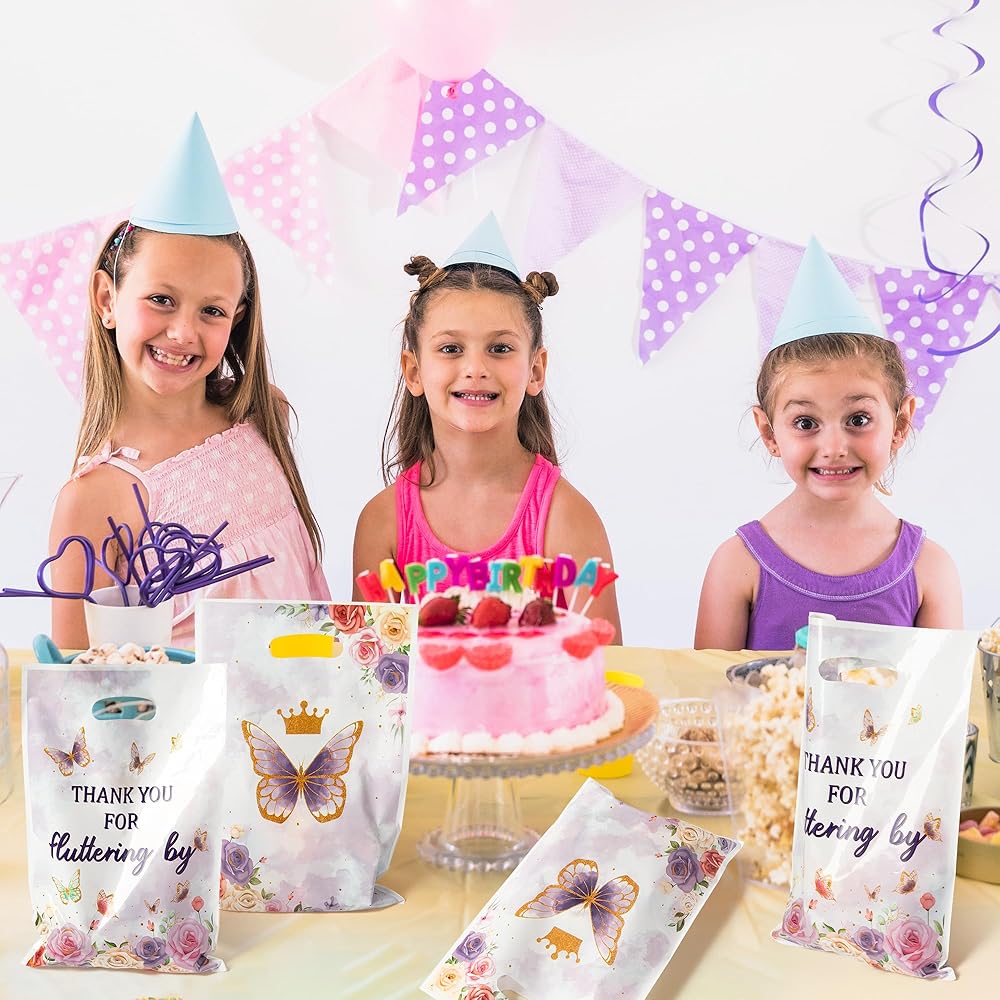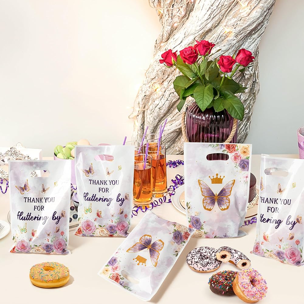 حقيبة هدايا للحفلات على شكل فراشة من ANGOLIO - 50 قطعة لحفلات العودة إلى المدرسة أنيقة باللون الأرجواني على شكل فراشة مطبوعة على الوجهين، شكرًا لك على الرفرفة من أجل حلوى عيد الميلاد والوجبات الخفيفة والحشرات ومستلزمات الحفلات