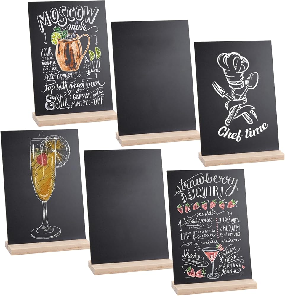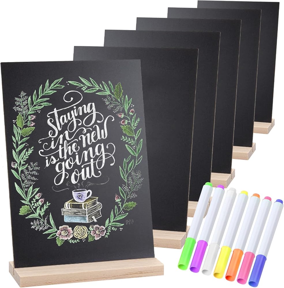 لافتات سبورة خشبية صغيرة عتيقة - مجموعة من 6 قطع | لافتة سبورة للطاولة مقاس 6 × 9 بوصة مع حوامل قاعدة | لافتة سبورة طباشير صغيرة مزخرفة مع 7 أقلام ألوان مائية