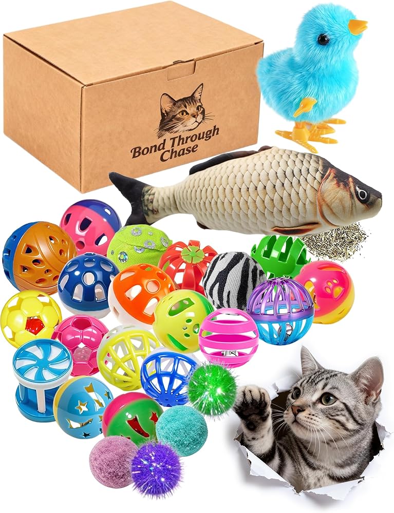 - كرات جلجل ملونة: 7 كرات نابضة بالحياة مع أجراس جلجل تشجع على الانقضاض والمطاردة، مثالية للقطط المرحة.