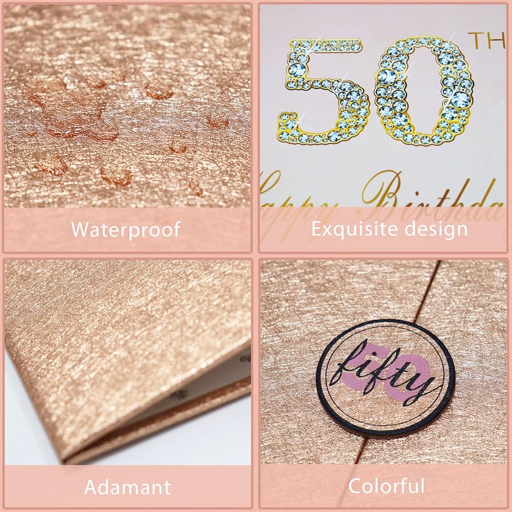 • 【تصميم رائع】- تحتوي الشهادة الذهبية الوردية على شارة مذهبة على الغلاف، والجزء الداخلي من شهادة التوقيع مقسم إلى ثلاثة أجزاء، والصفحة الوسطى مطبوعة برسالة "50th Happy Birth". يمكن فتح لوحة توقيع عيد الميلاد الخمسين هذه المصنوعة من الذهب الوردي مباشرةً ووضعها على الطاولة. نصائح: لا يوجد قلم.