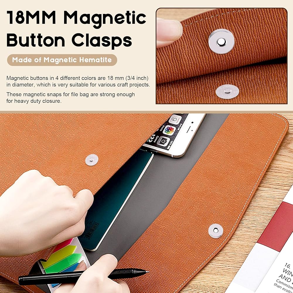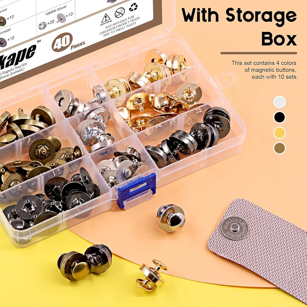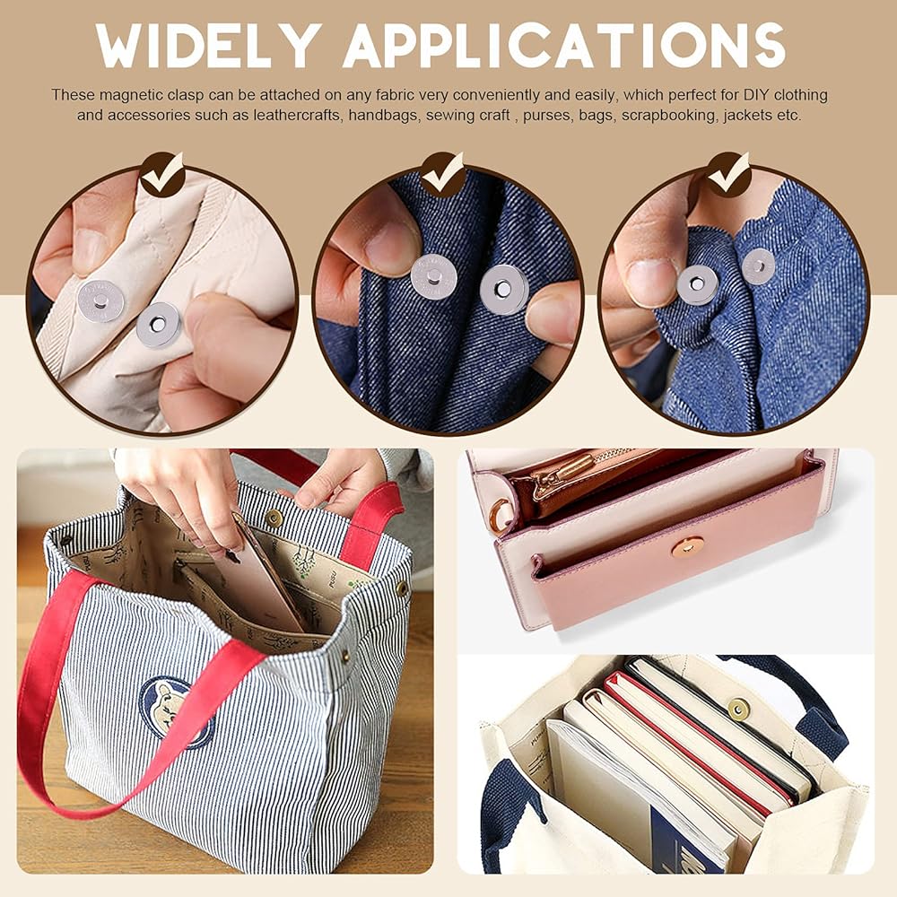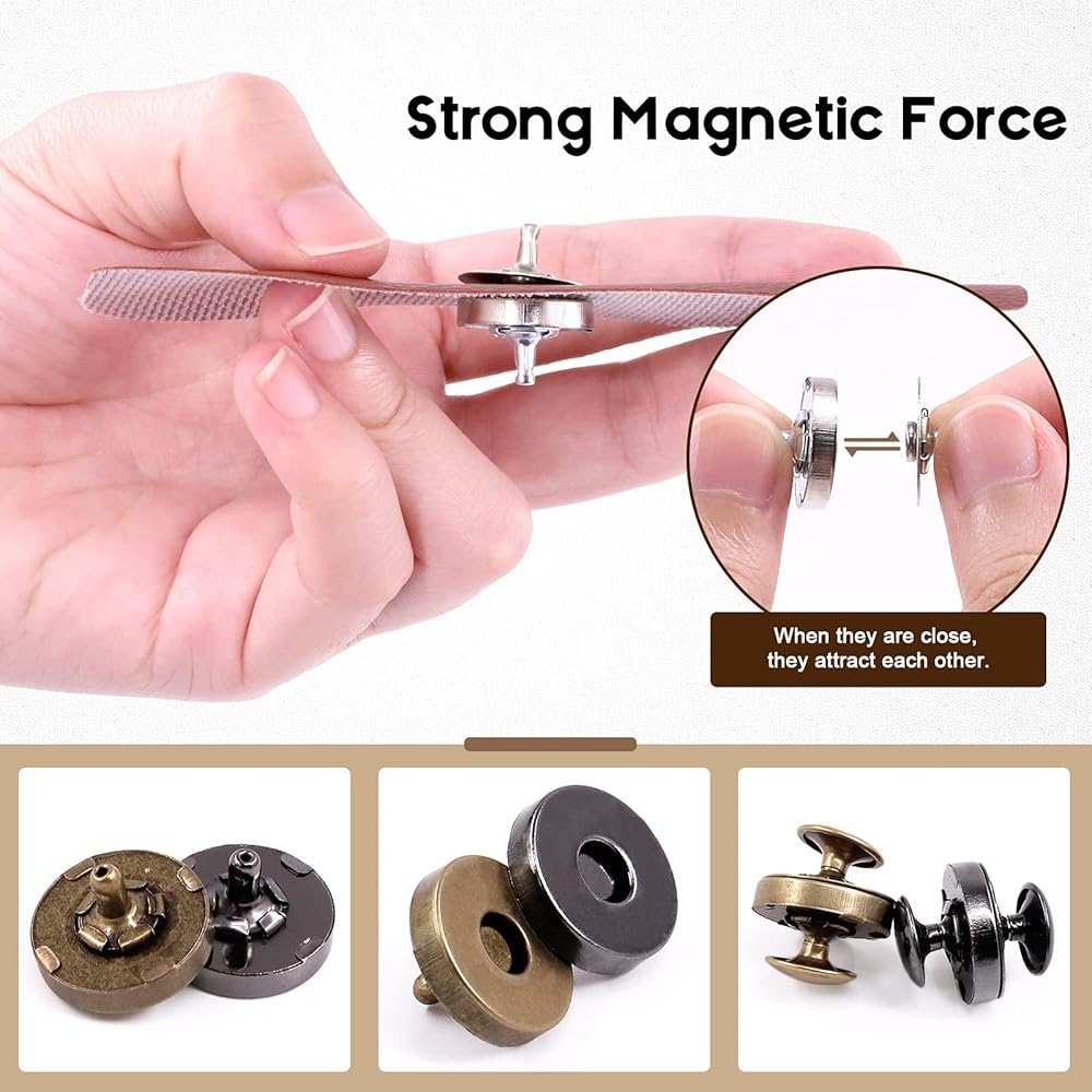 ✔ 3, These magnetic snaps are great to work with different materials in all kinds of sewing projects, such as fabric, denim, leather, purse, vest, bag, even arts and crafts, scrapbooking, etc.