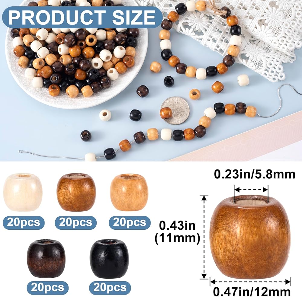 100 قطعة من الخرز الخشبي ذو الفتحات الكبيرة 11 × 12 مم، خرز شعر من الخشب الطبيعي للهالوين، 5 ألوان مستديرة من الخرز المكرامي فضفاض لقلادة وسوار صنع المجوهرات والحرف اليدوية