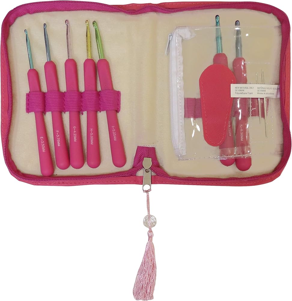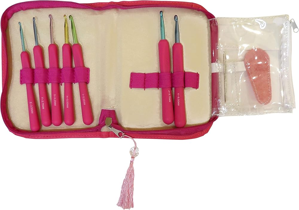 Full of crochet hooks and yarn needles in a zipper-close pink carrying case, this makes a great gift for crocheters or crochet hook kit for beginners!