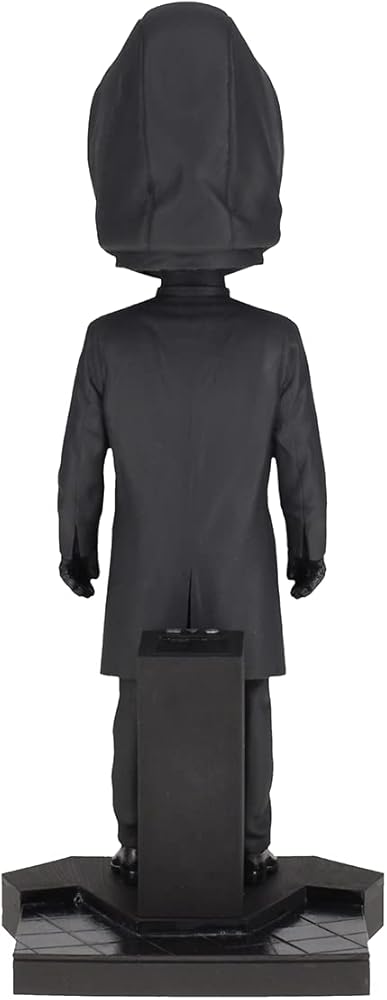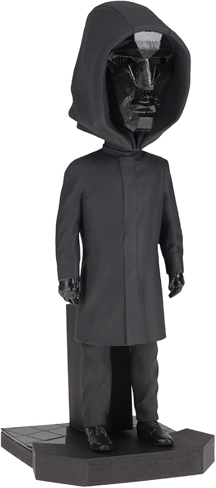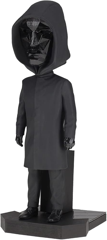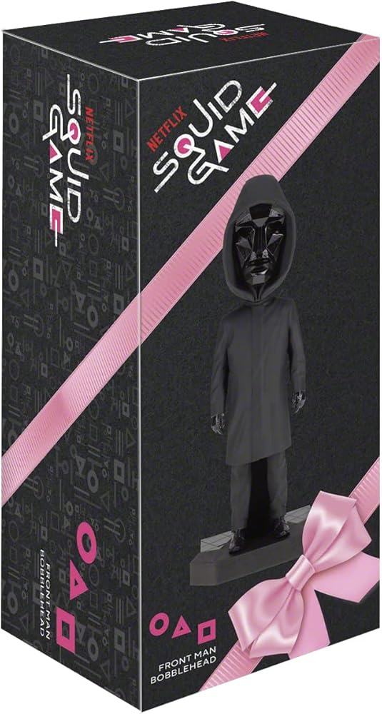 • SQUID GAME BOBBLEHEADS – The Front Man - The mysterious man that overlooks the entire competition. The Front Man is depicted in his classic all-black outfit, black mask, and standing in his control room ready for the games to begin.