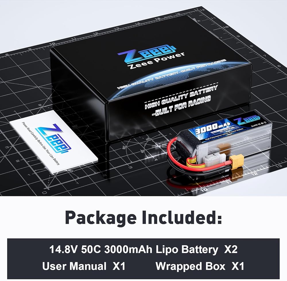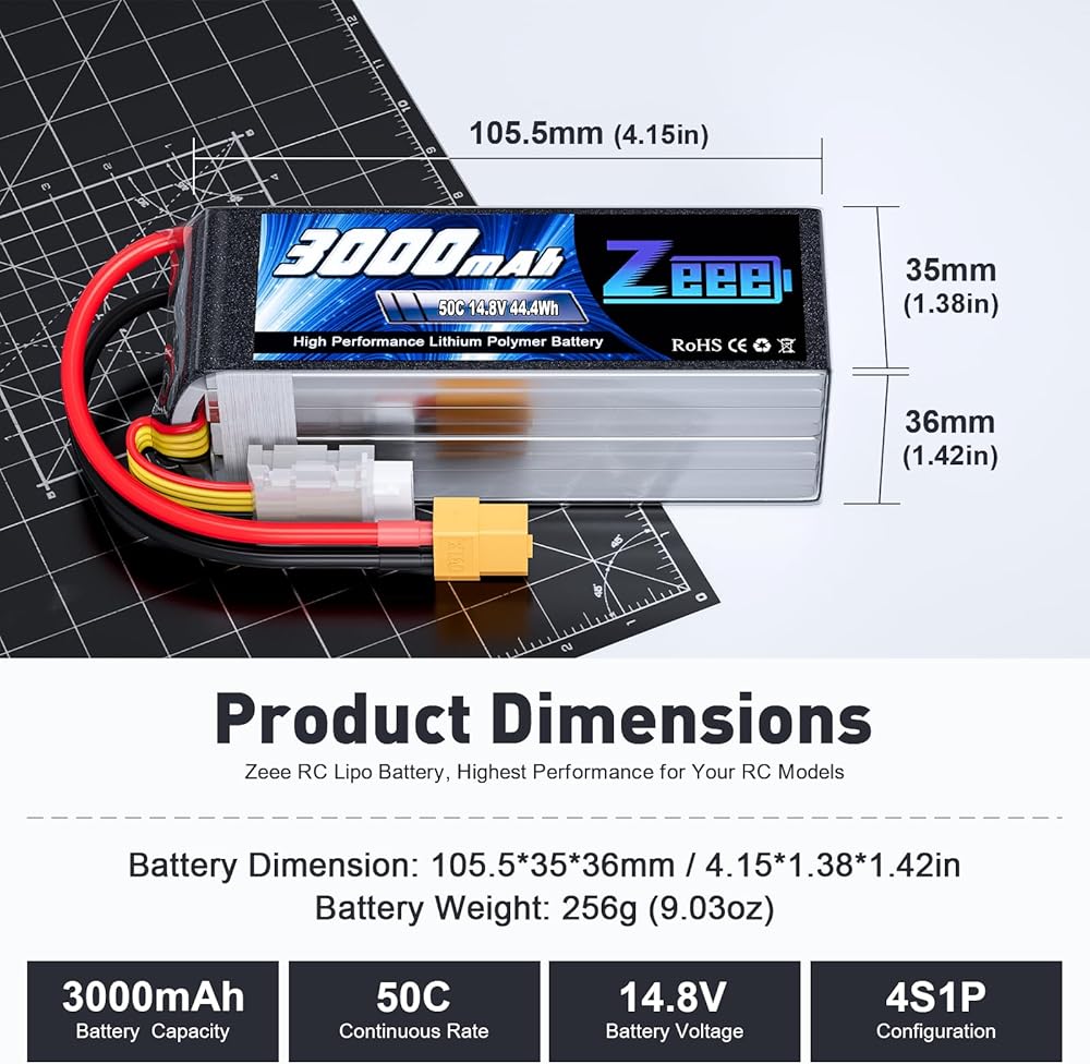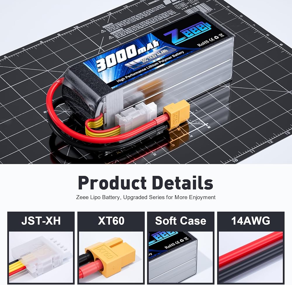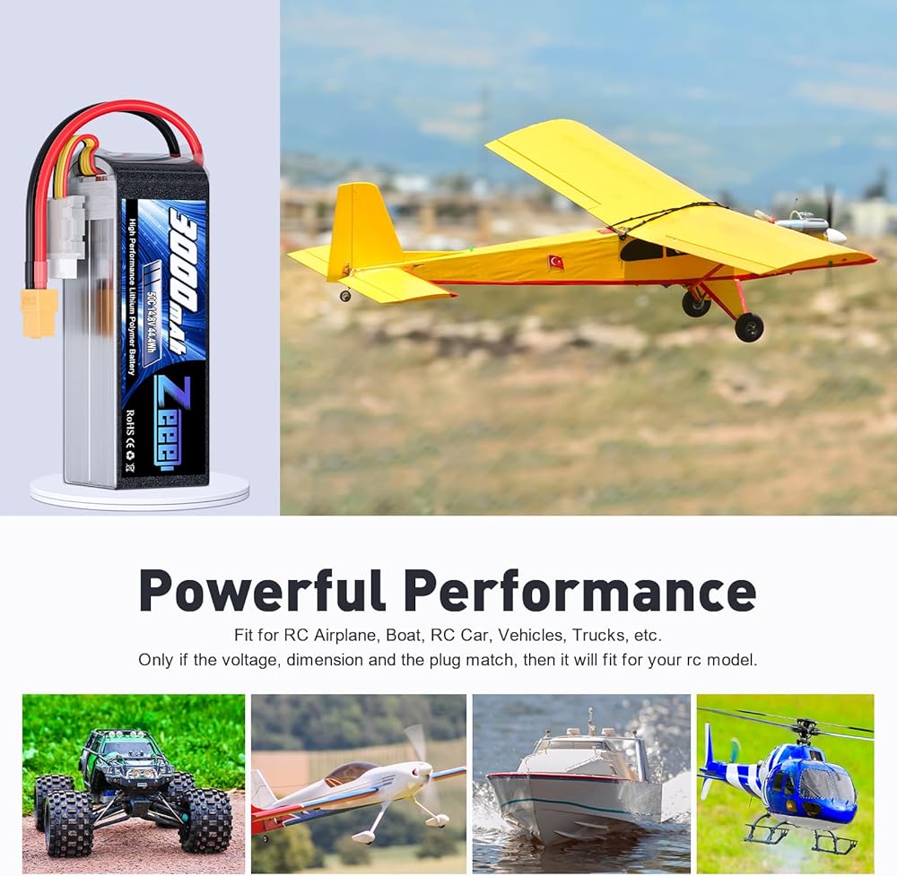تطبيق بطارية 14.8 فولت - بطارية ليبو Zeee 4S 3000 مللي أمبير في الساعة متوافقة مع طائرات RC وطائرات الهليكوبتر وقارب RC والسيارات والشاحنات ونماذج RC بمقياس 1/10 أو أكبر، وSlash VXL، وE-Revo Brushless وSpartan، وSlash 4x4 VXL ، E-Maxx Brushless، وما إلى ذلك (فقط إذا كان الجهد والأبعاد والقابس متطابقين، فسيكون مناسبًا)