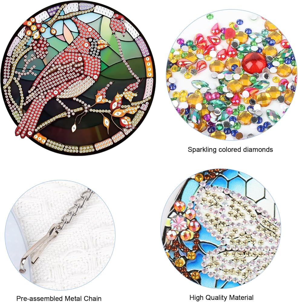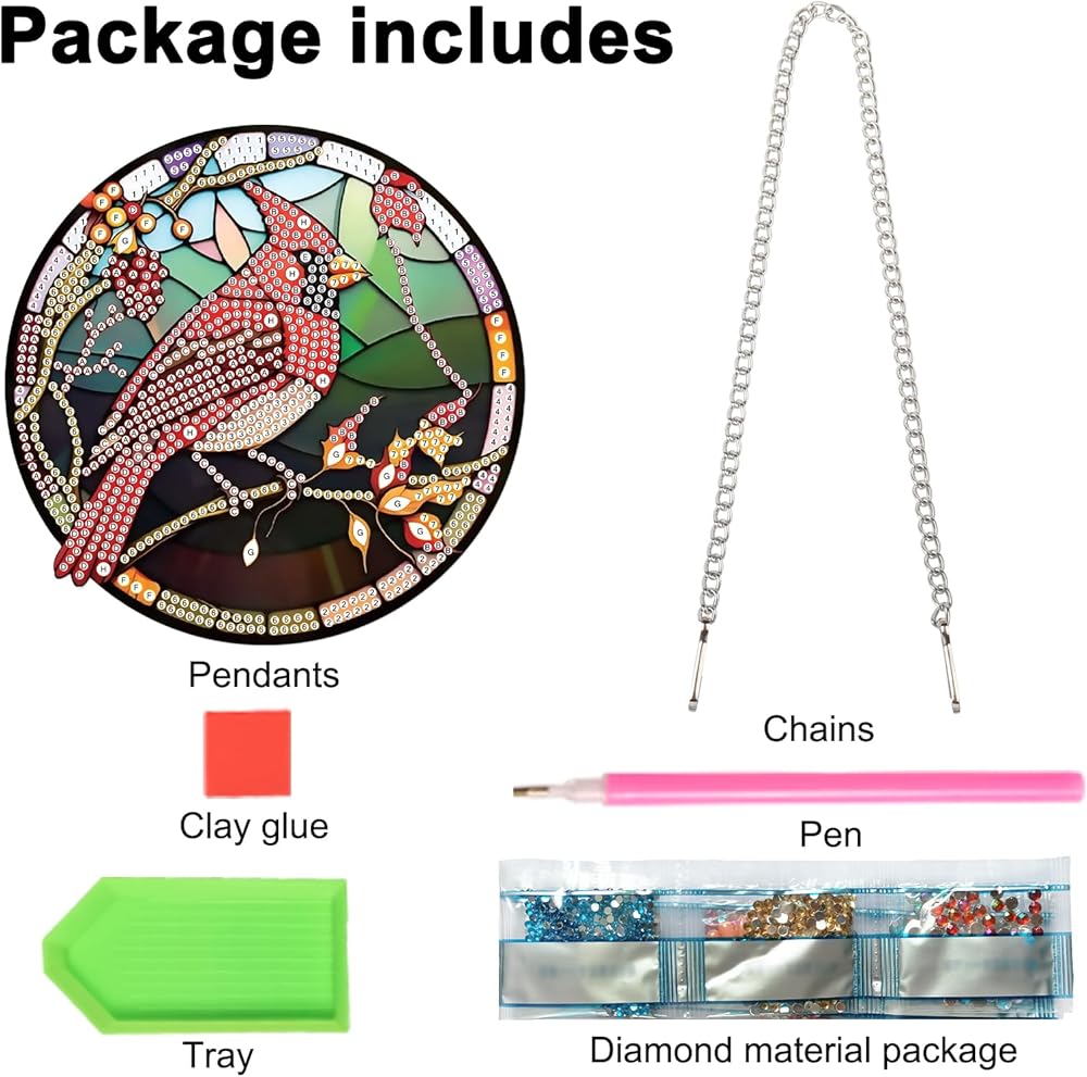 Hot Melt Adhesive&Acrylic Sheet&Metal Chain: The diamond painting diamond art custom diamond painting diamond hot melt adhesive is featuring in good viscosity,so drills and rhinestones will be not easy to fall off,reliable and durable for long-term using and storing,no fading or wearing.The diamond art wind chimes have a single-sided design for sticking diamonds on both sides,enhancing shine and beauty.The diamond painting pendant kit consists of an acrylic sheet and a metal chain.