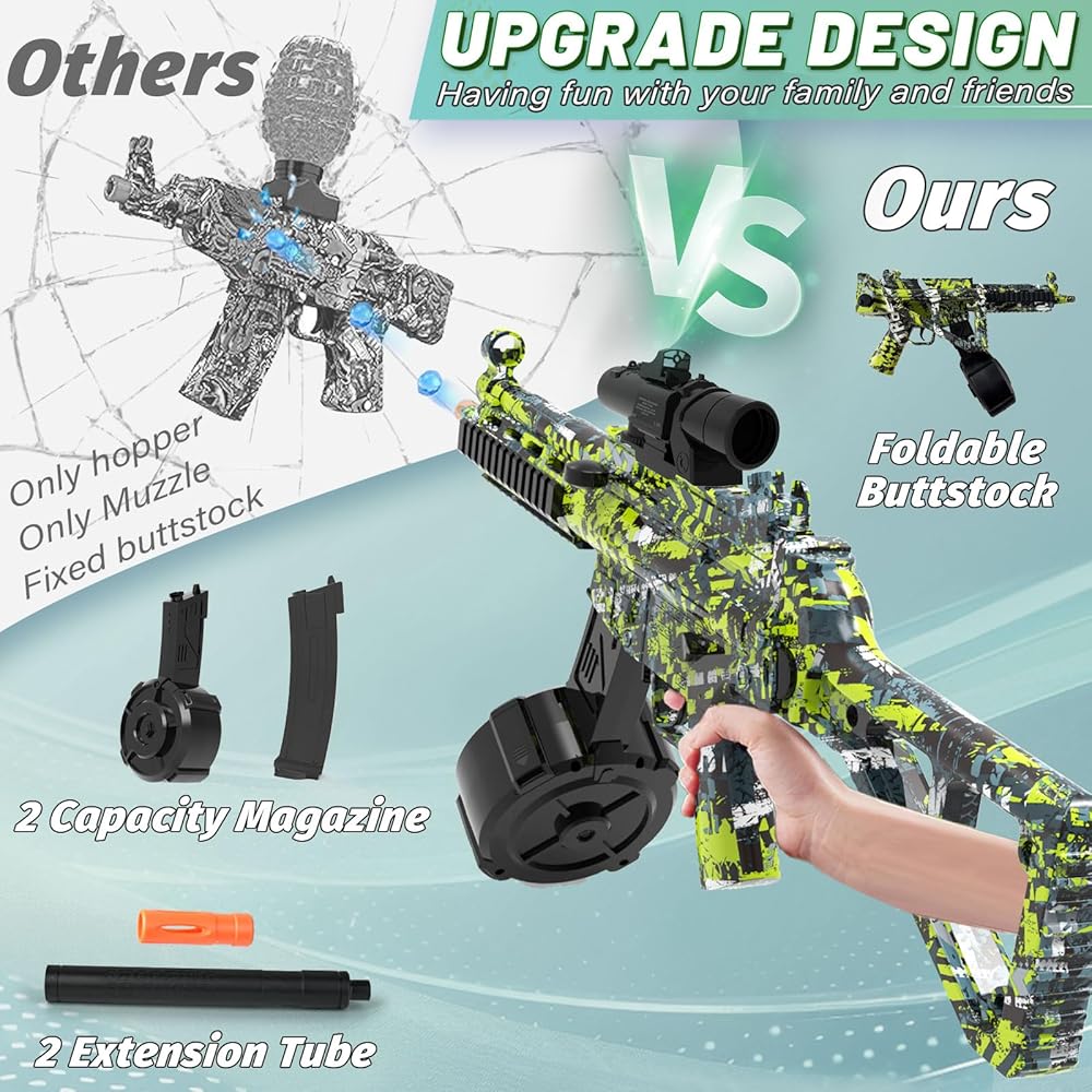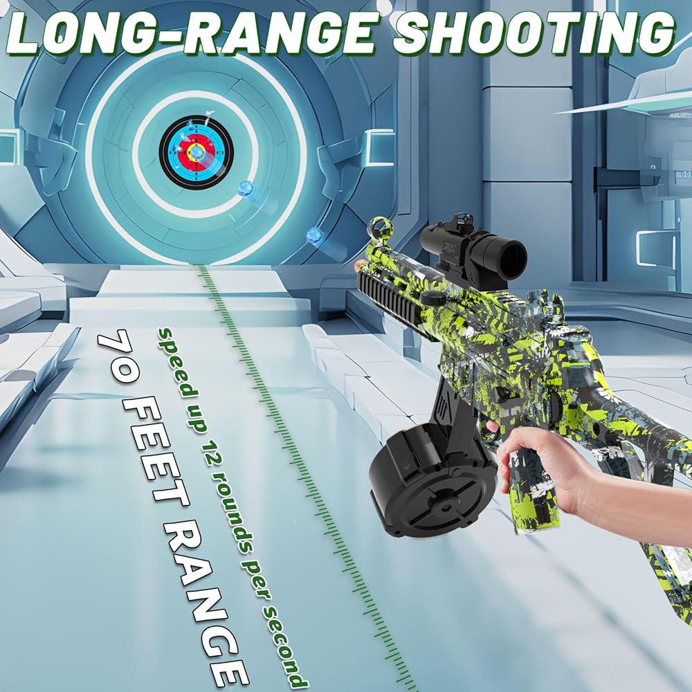 لعبة مسدس الرش الكهربائي: مصنوعة من مادة أكريلونتريل بوتادين ستايرين عالية الجودة، وتصميم صناعي متين وجسم مركب من النايلون، كما أن قاذف الكرة الرش التلقائي مع علبة تروس متطورة توفر أداءً أسرع وقويًا، نطاق إطلاق يصل إلى 70 قدمًا و12 طلقة في الثانية معدل إطلاق تلقائي بالكامل