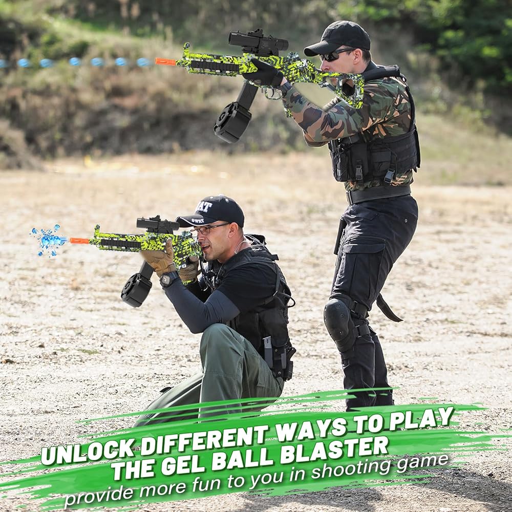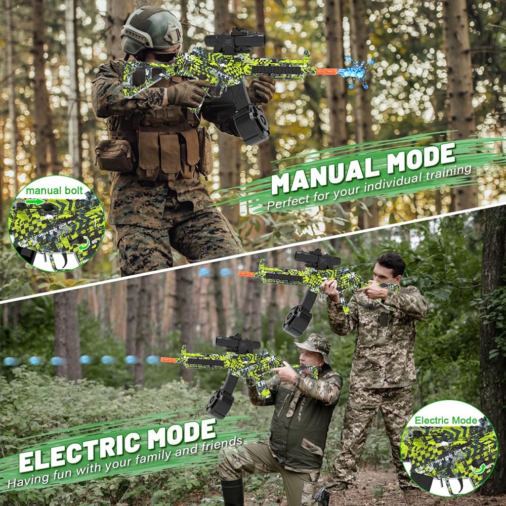 الوضع التلقائي واليدوي: تحتوي لعبة رش الجل على وضعين لتوفير المزيد من المرح لك، يمكن استخدام وضع ناسف كرة الجل التلقائي لألعاب الفريق في الهواء الطلق مع عائلتك أو أصدقائك، ويمكن استخدام وضع ناسف رش الجل اليدوي لممارسة لعبة الرماية الخاصة بك.