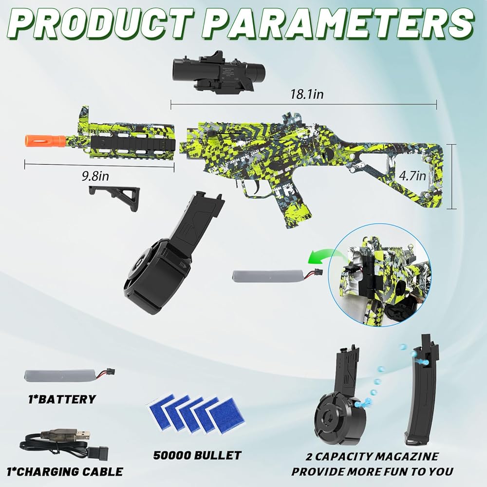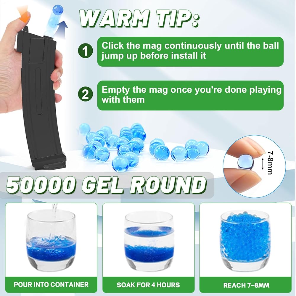بطارية قابلة لإعادة الشحن: تعمل ببطارية 7.4 فولت، مما يسمح للعبة مسدس الكرة المتناثرة بتوفير عمر بطارية طويل مستمر ومستقر لمعركة التصوير الخاصة بك، وتأتي مع كابل USB للشحن. يمنحك المسدس ذو الكرة الهلامية بمعدل إطلاق نار سريع وإطلاق نار بعيد المدى تجربة مثيرة للاهتمام وحقيقية للغاية