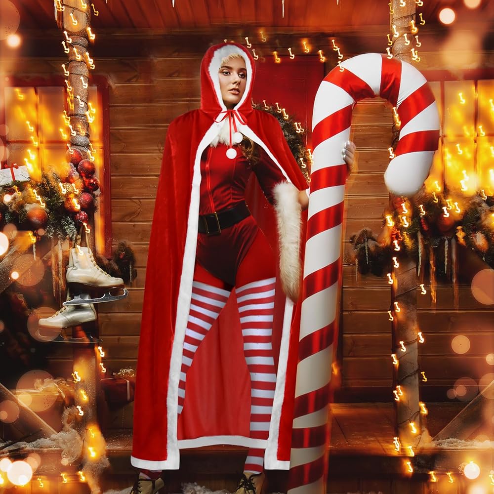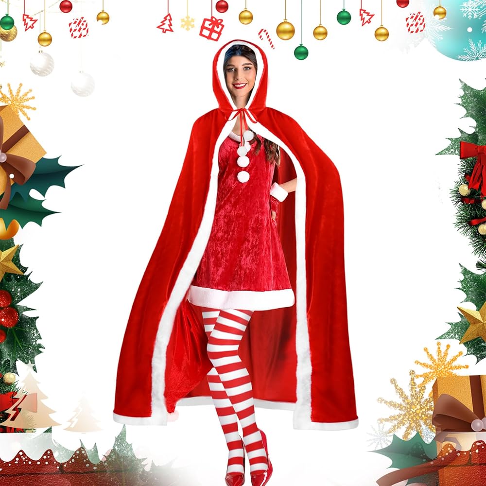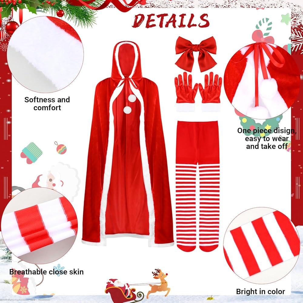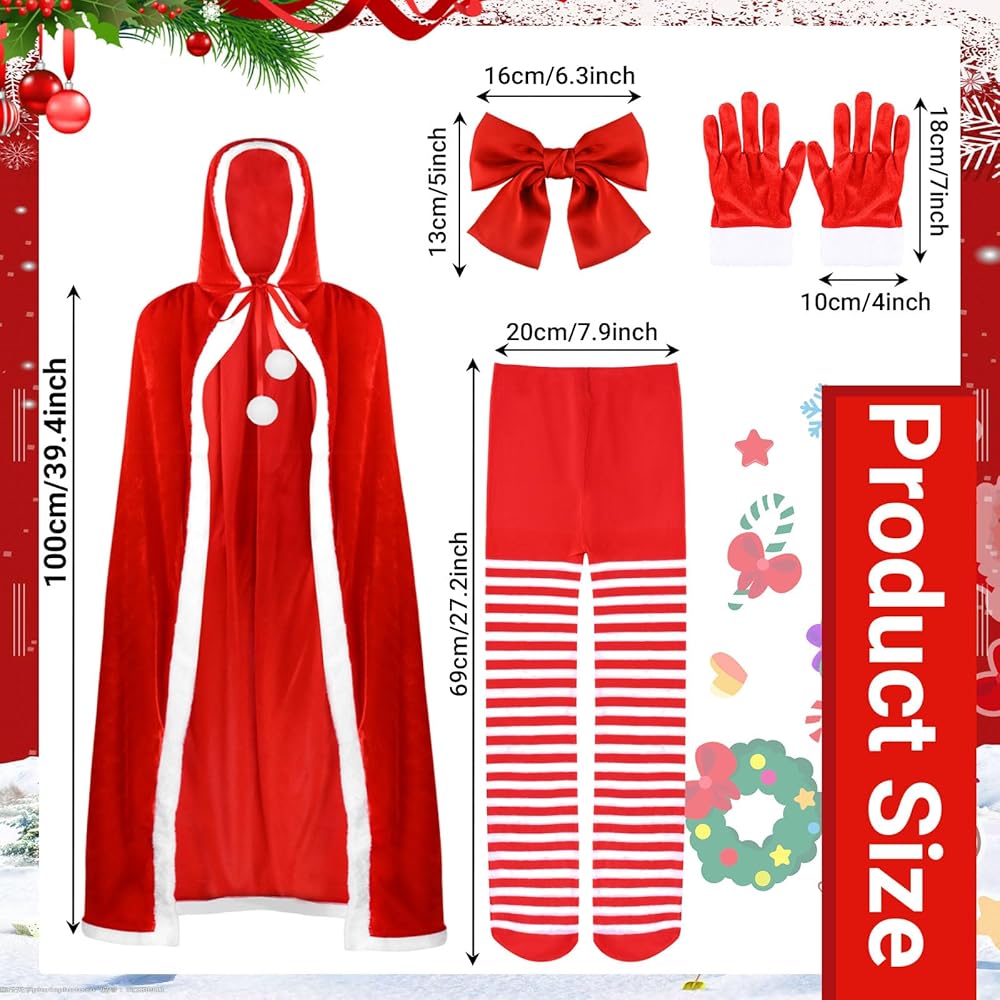 Christmas Santa Cloak Costume Set Including Red Velvet Hooded Cape Gloves Socks Bow Headband Hair Clip for Xmas Party Dress Up Accessories