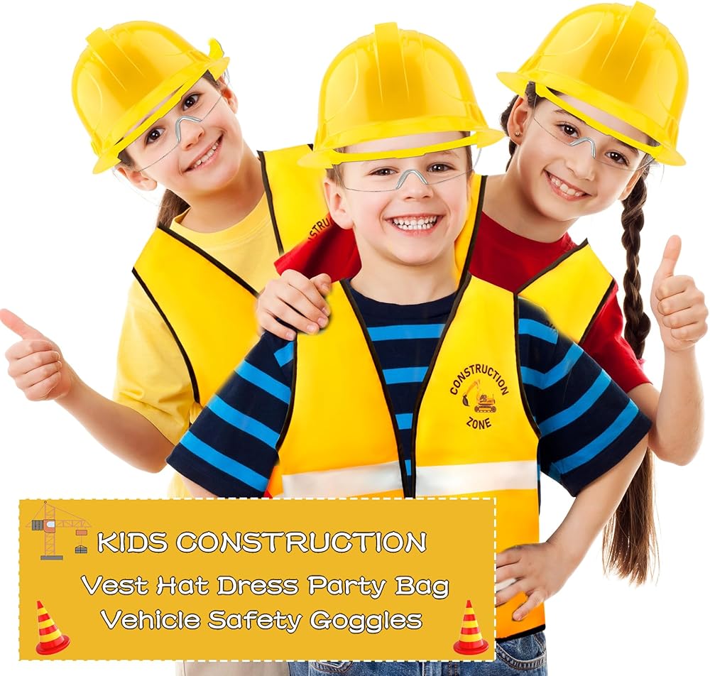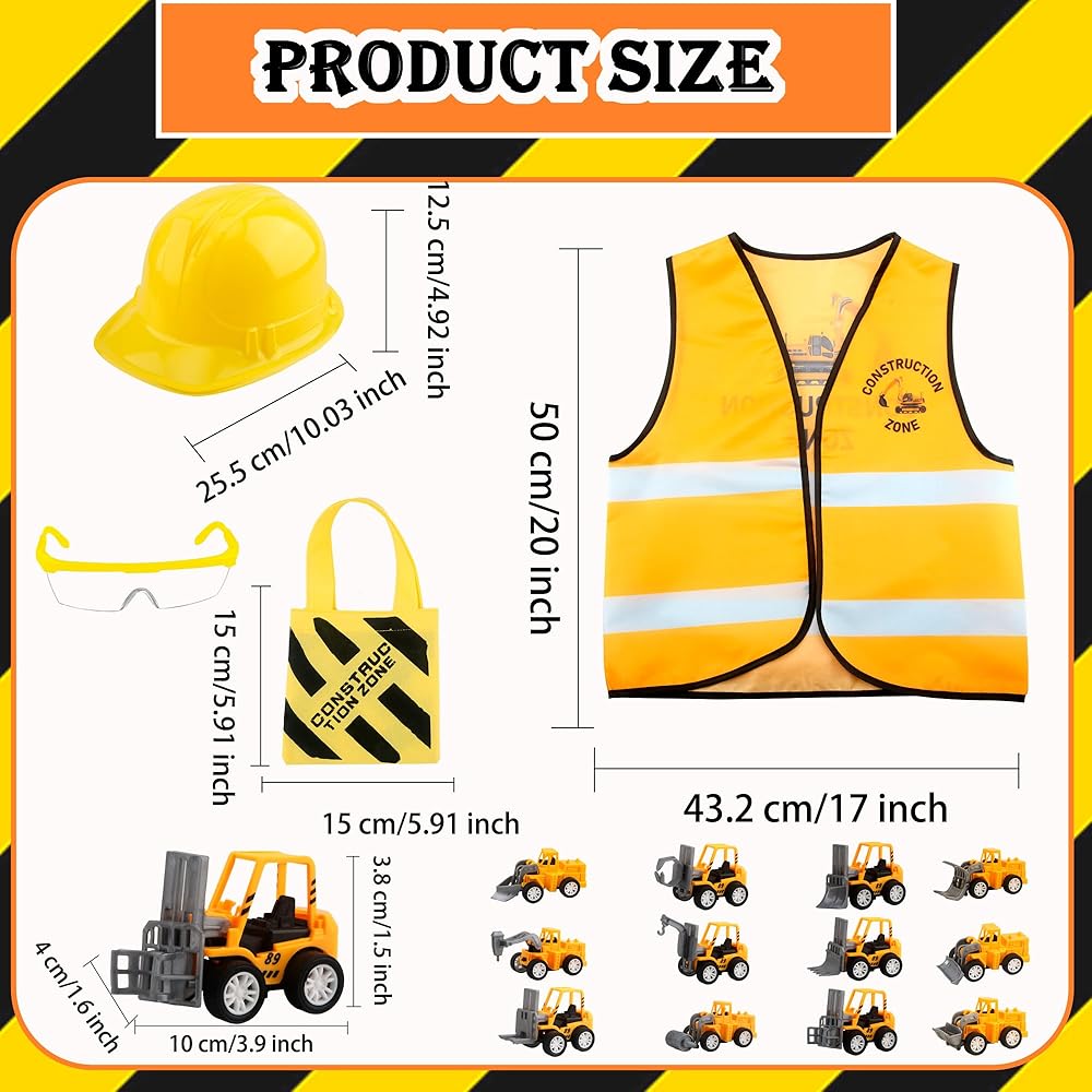 【Quality Materials】: Construction tote bag and vest are made of non-woven fabric as the main material, which is light and easy to carry; comfortable to wear, wrinkle-resistant and shrink-resistant, and well-made. Our safety helmets are made of soft plastic material, which will not cause pressure on your head. The quality plastic makes the mini construction vehicle sturdy and durable, and it can be used for a long time without being easily damaged