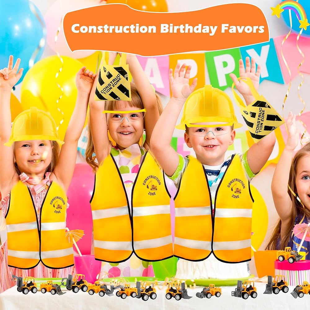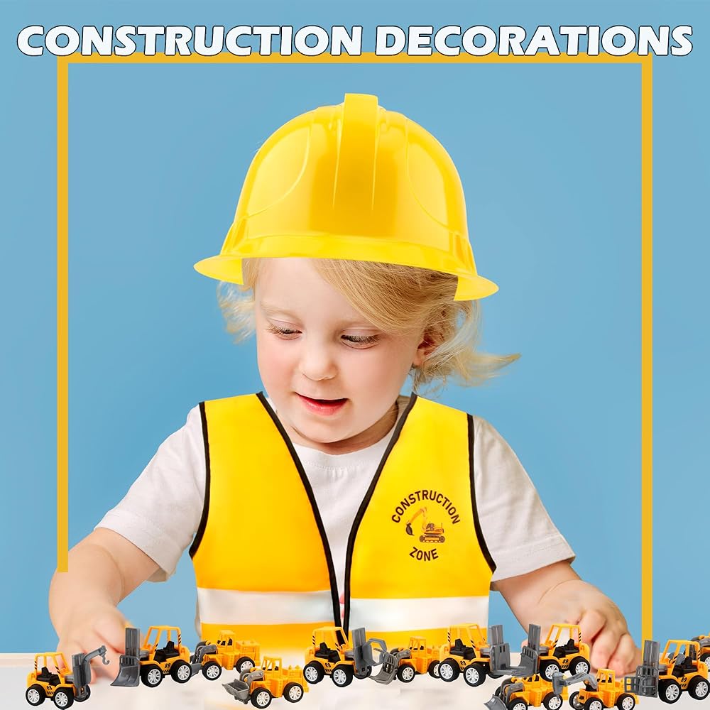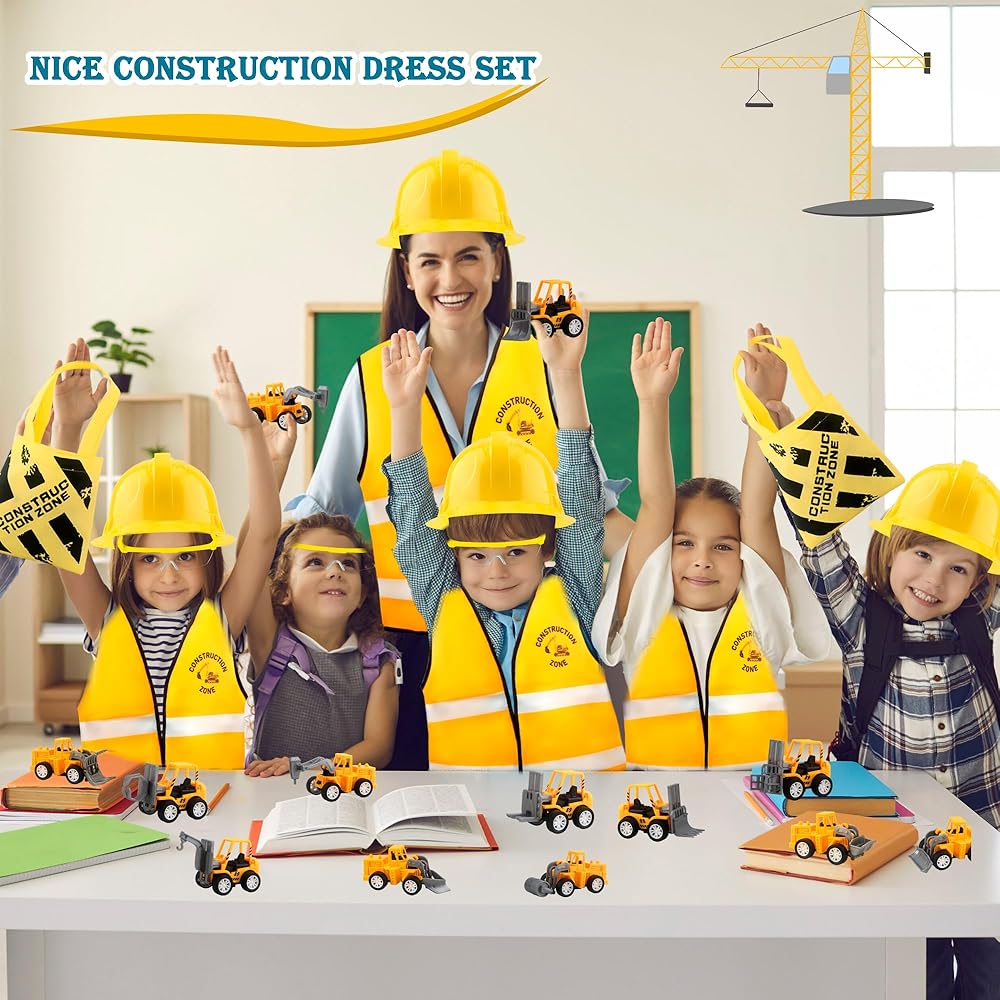【Package Contents】: You will receive 1 pack of engineering party supplies including 4 construction hats, 4 construction vests, 4 construction bags, 4 toy glasses and 12 different styles of toy construction pull-back cars, a total of 28 pieces. Sufficient quantity to allow more people to participate in role-playing parties