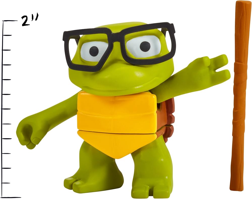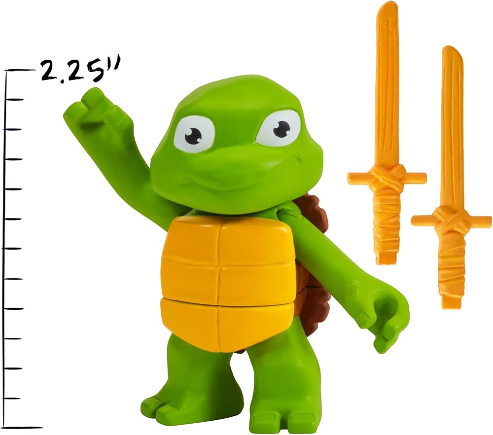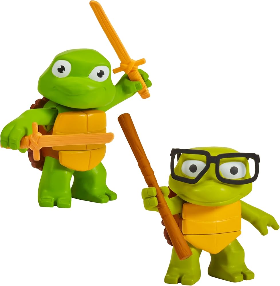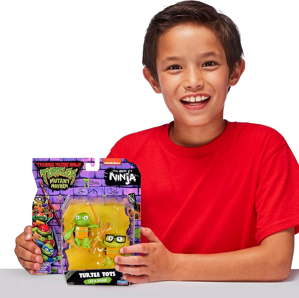 This Turtle Tots 2-pack includes 3.25-Inch Leonardo and Donatello figures, as seen in the hit movie! Before they became ninjutsu experts, the Teenage Mutant Ninja Turtles were fumblin', bumblin' Turtle Tots who were always causing havoc and driving Splinter nuts! As the Turtle Tots matured, Master Sensei Splinter taught his young mutants the way of the ninja by watching martial arts videos. The tots learned quickly and Splinter even made them training weapons to perfect their ninja skills. By the time they reached their teenage years, they were quickly transformed into the Teenage Mutant Ninja Turtles! Set includes their iconic ninja weapons.